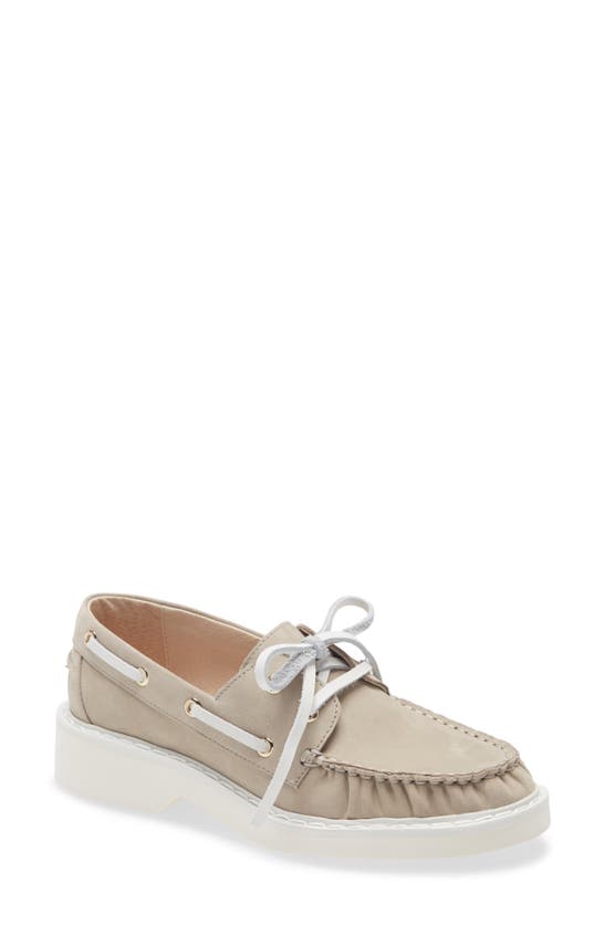 A moc-stitched toe and boat shoe lacing detail a stylish leather loafer updated with shiny grommet hardware and a platform sole.