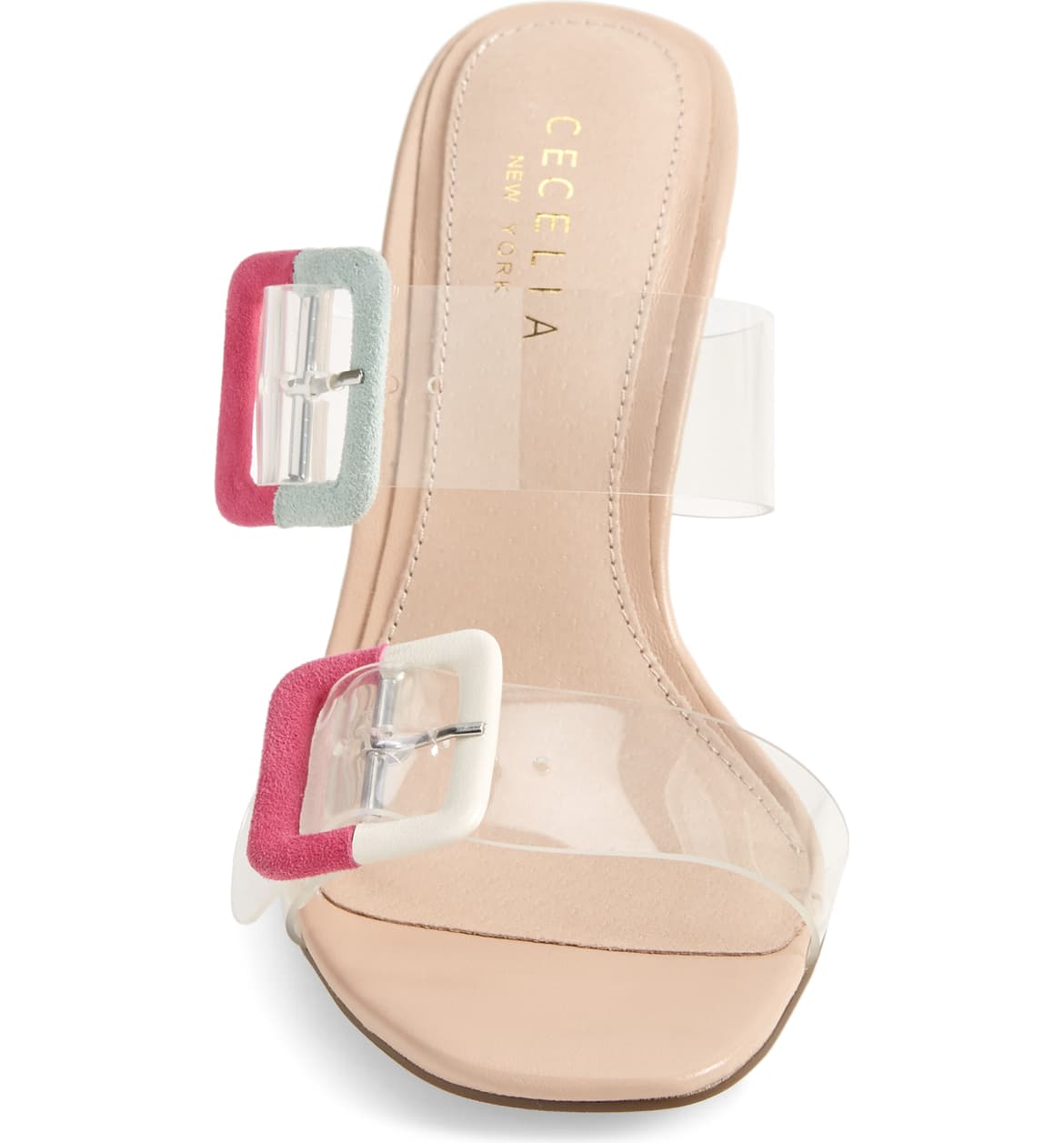 Cecelia New York Vannah Sandal Alabster Tan Multi Clear Open Toe High Heel Mules