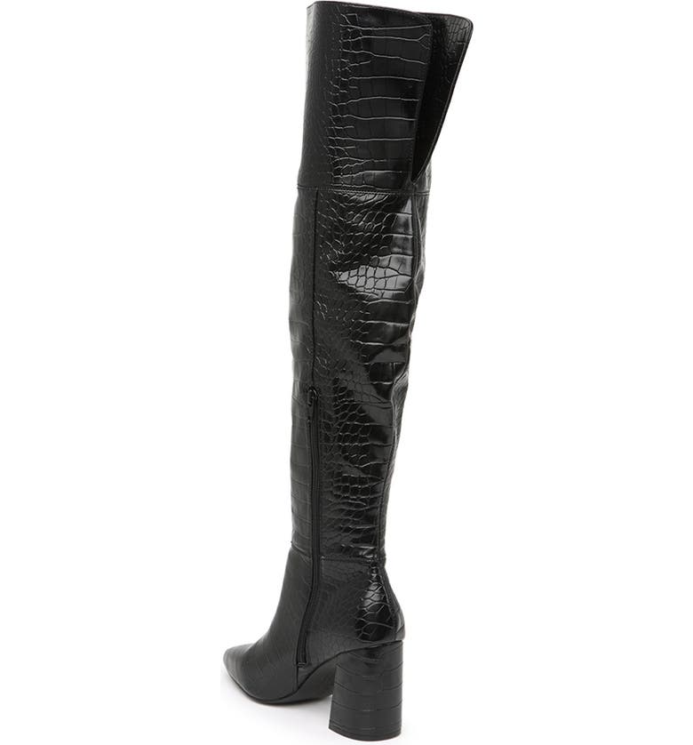 A chic over-the-knee boot features a croc embossed design with a covered block heel for eye-catching style.
