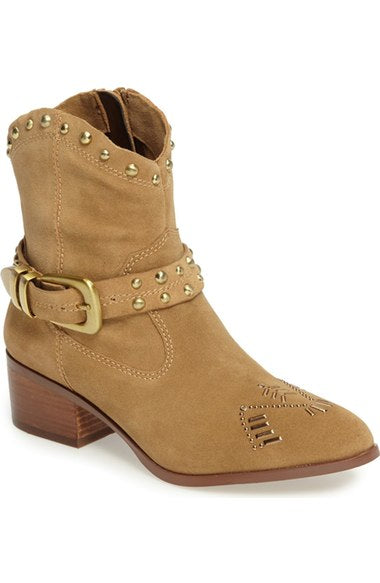 BCBG Lokki Cowboy Ankle Bootie Nude Suede Western Cowgirls Studded Buckle Boots