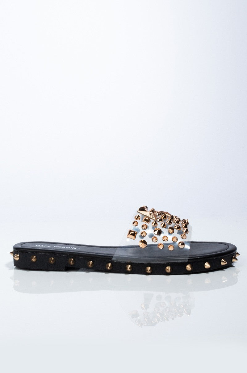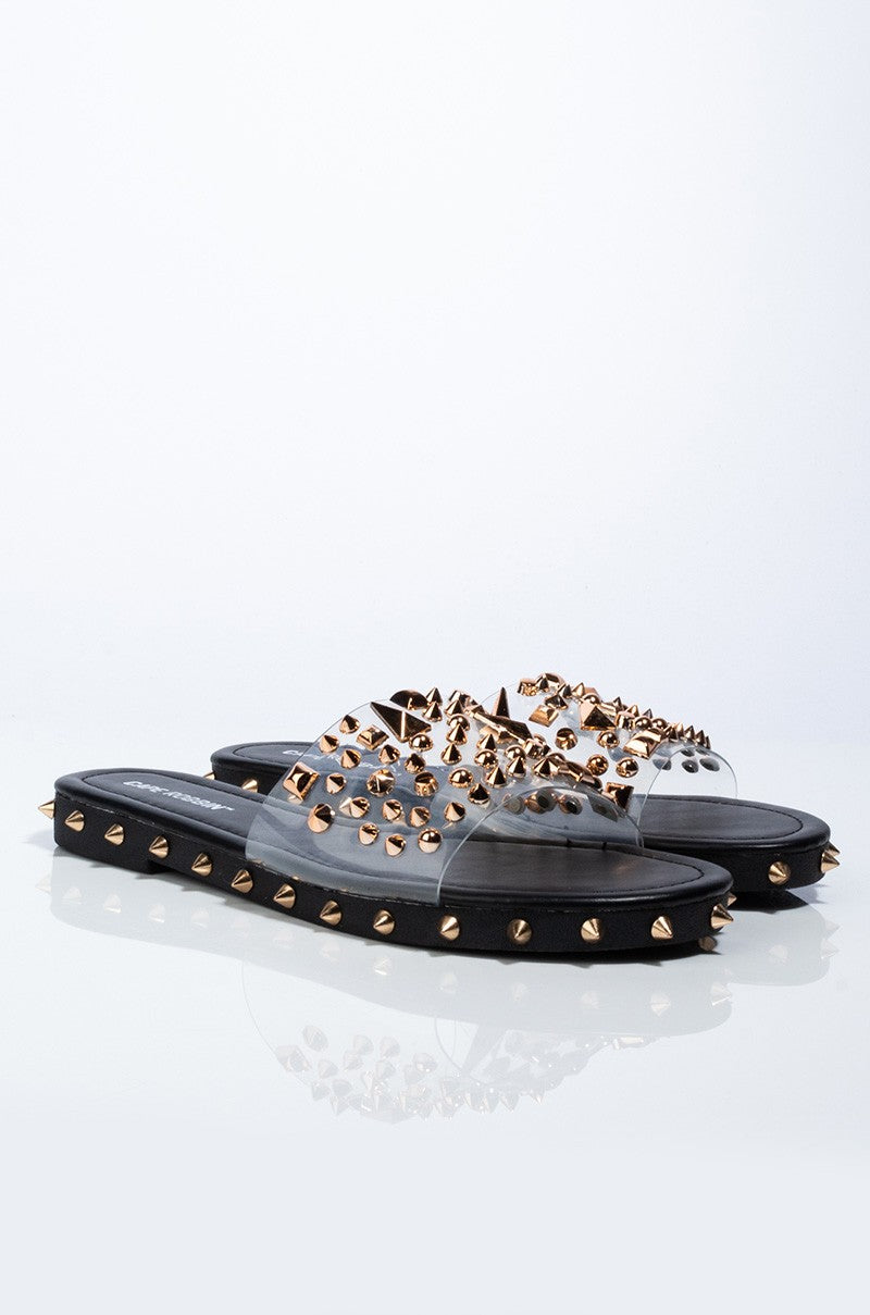 This pair has us so excited and we just can't hide it. The Inclination Studded PVC Sandal is a standout casual slide with a PVC upper, open toe, flat sole, and spiked studded detailing. Pair this sandal with your favorite denim and a cool jersey bodysuit to complete the look.