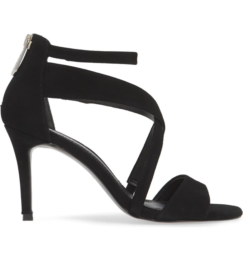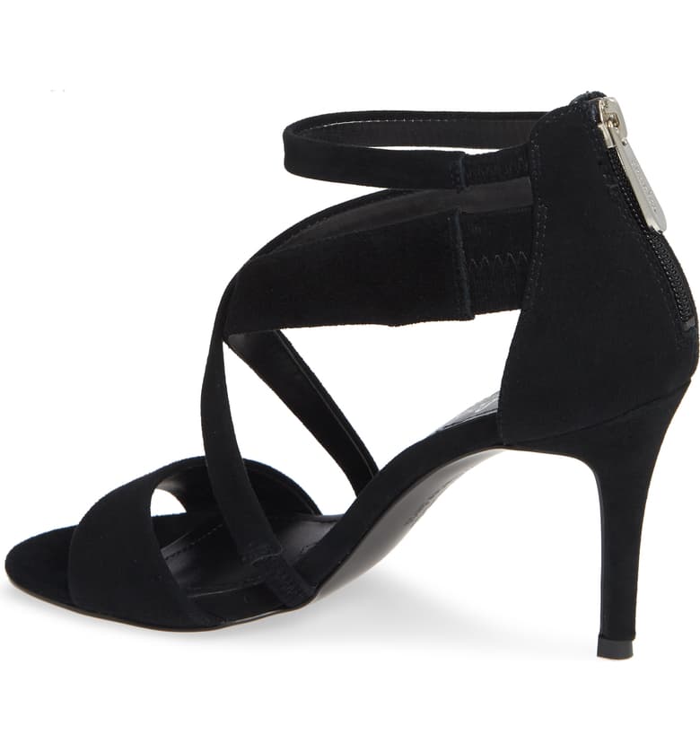 Mixed-width straps crisscross at the arch of an ankle-strap sandal made with a cushioned footbed.