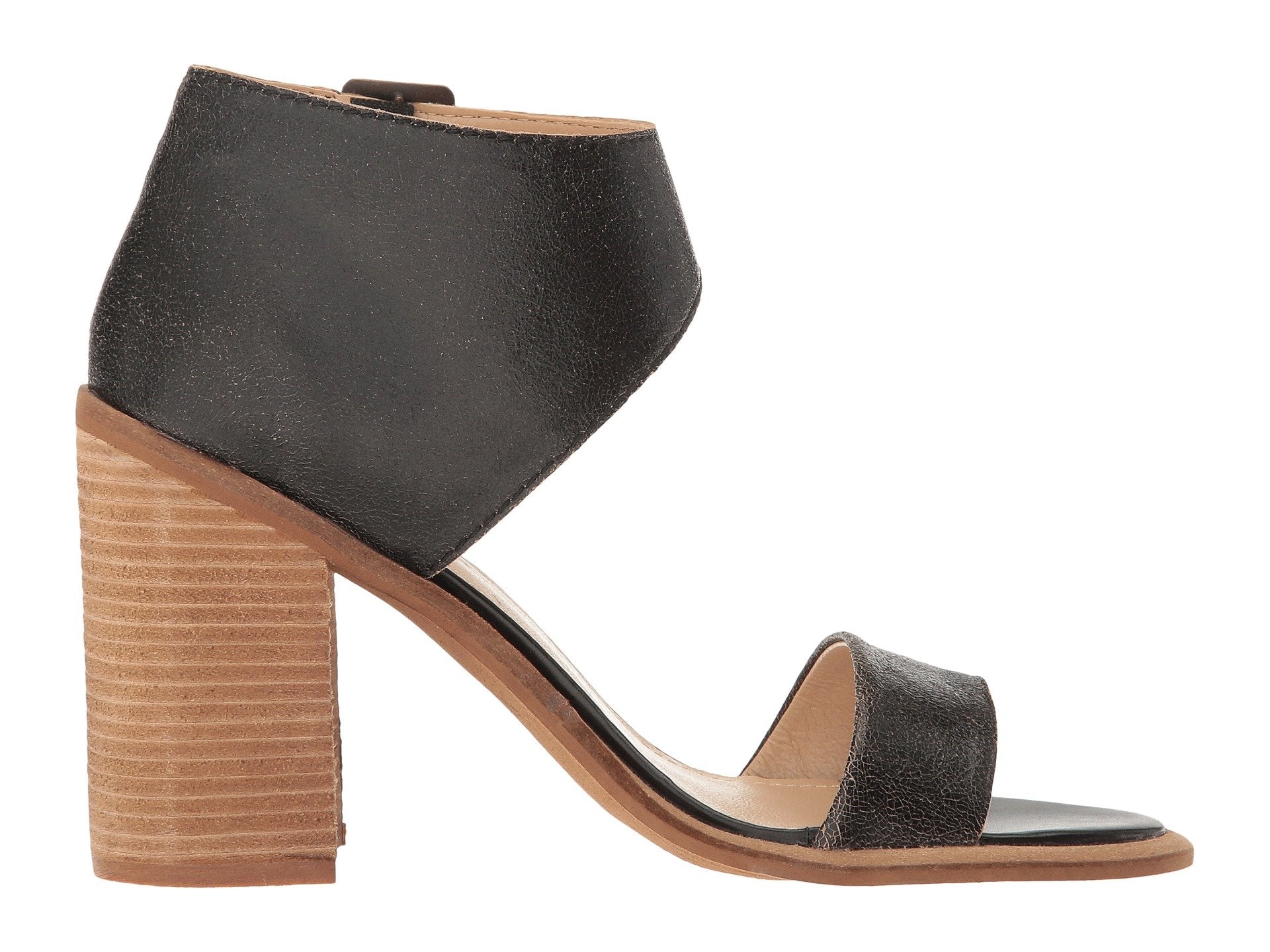 Asymmetrical ankle strap heeled sandal in distressed leather uppers.