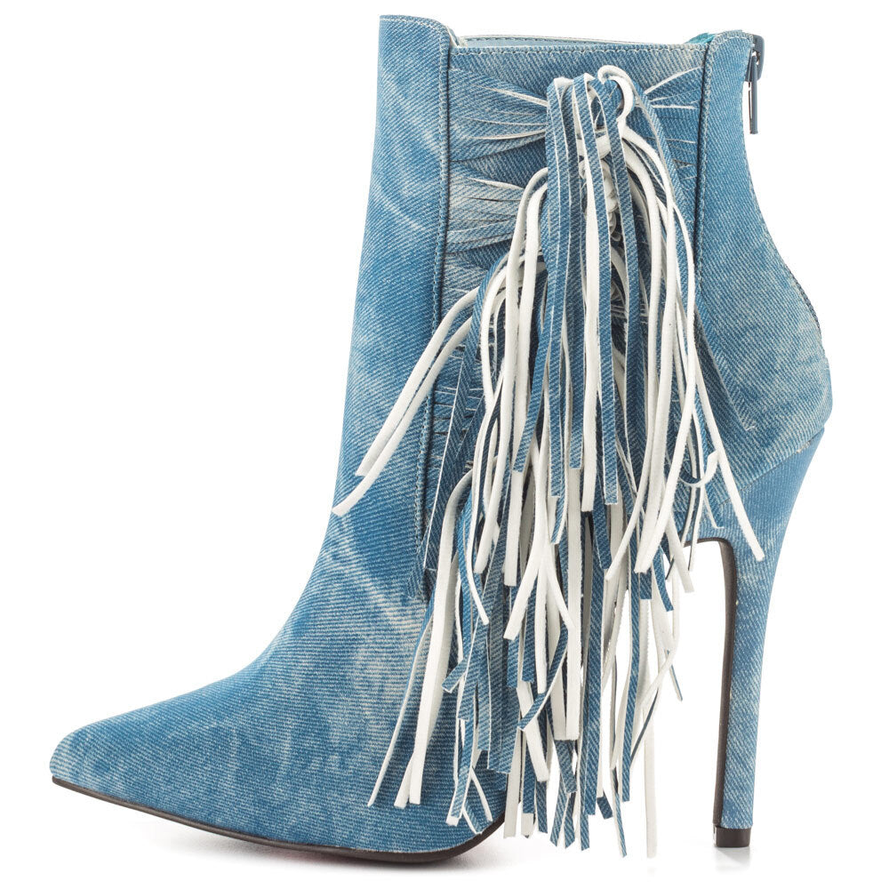 Luichiny Going Fast Pointed Toe High Stiletto Distressed Denim Fringe Ankle Boot