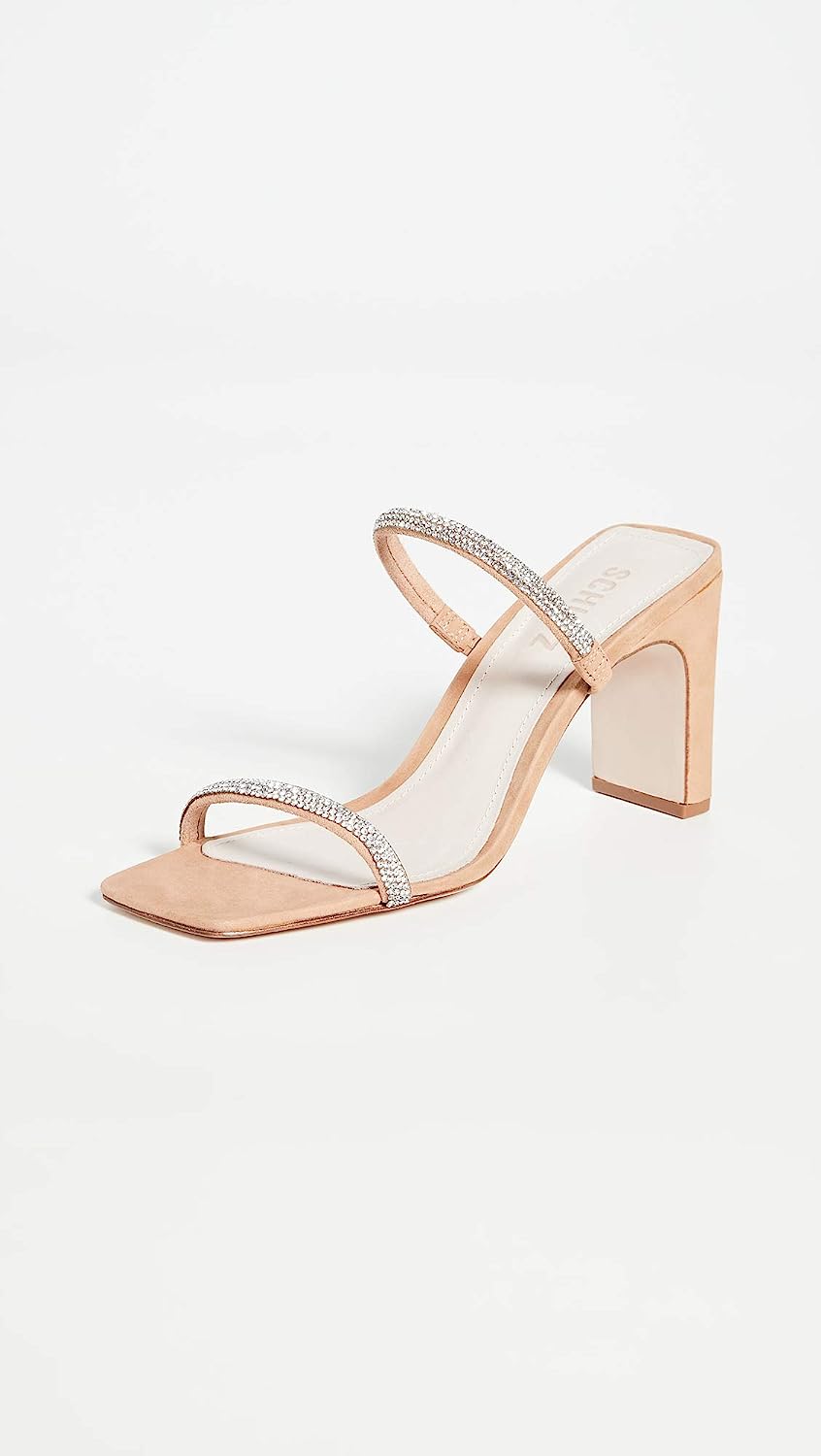 Schutz Salwa Nude Suede Rhinestone Open Toe Thin Strap Mid Heel Mule Sandals