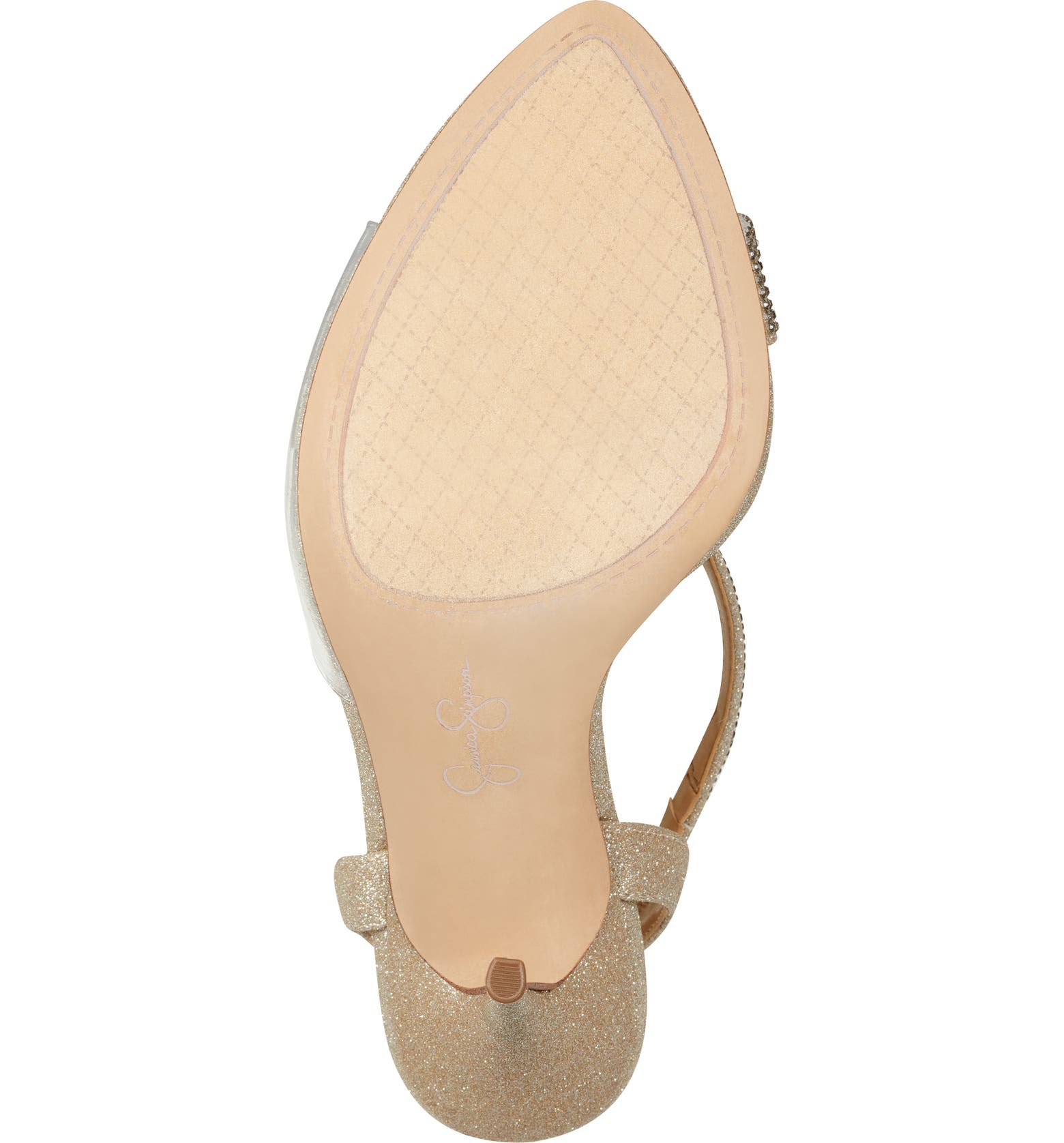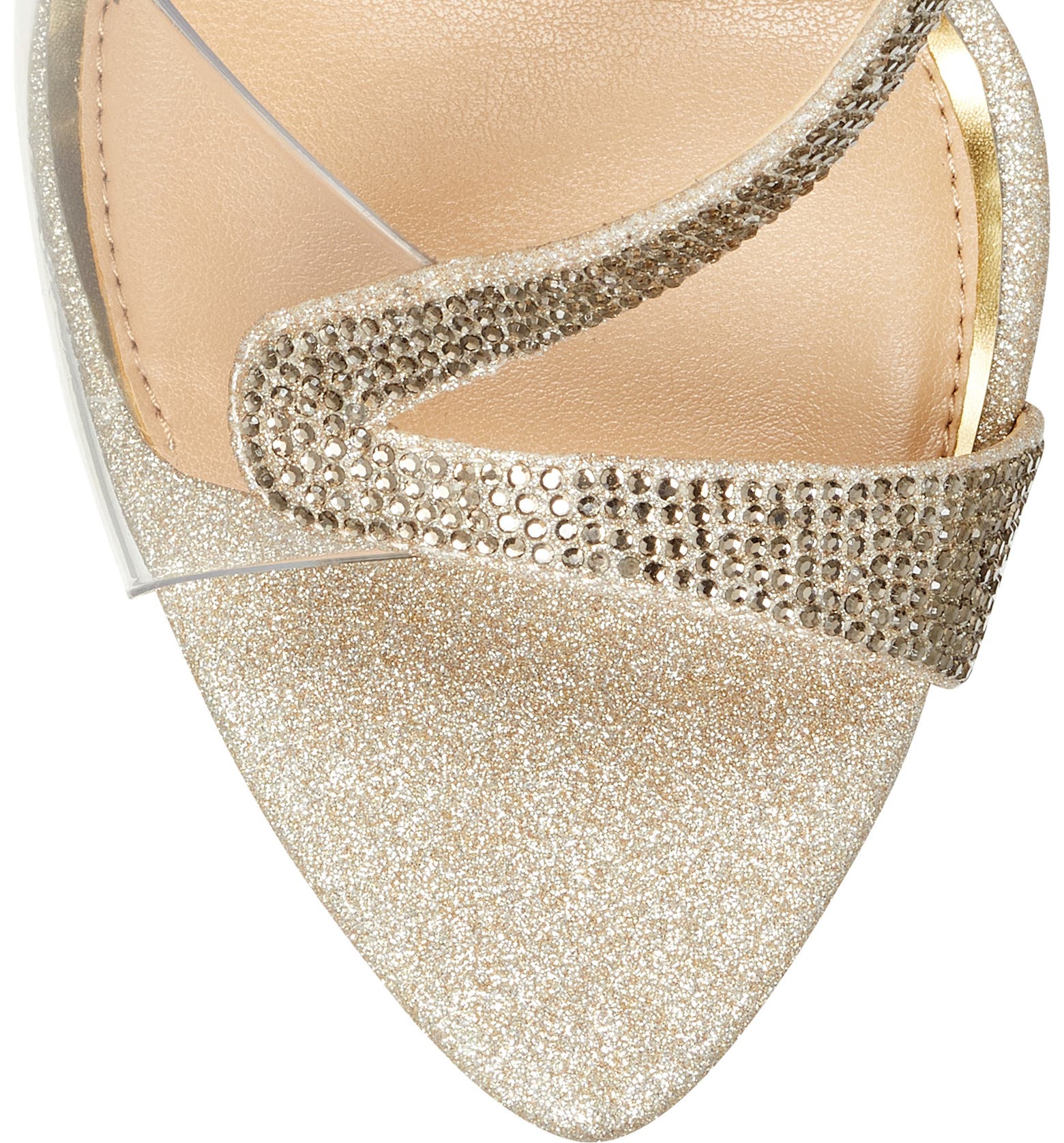 - A transparent panel creates a dramatic illusion effect on a stiletto sandal topped with shimmery, asymmetrical straps.
