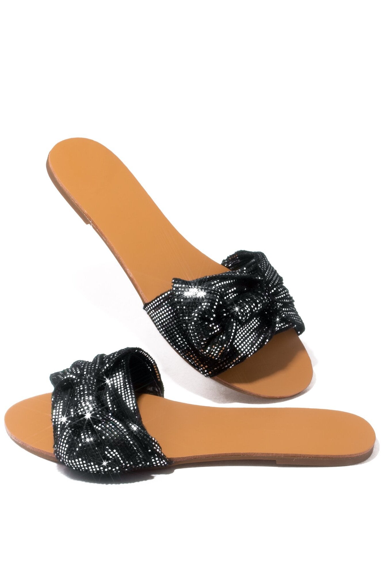 Flat Sandal open toe. The upper small grain rhinestone. Aflat rubber sole and cushioned interior. Pair with your favorite cozy sweats to complete the look.