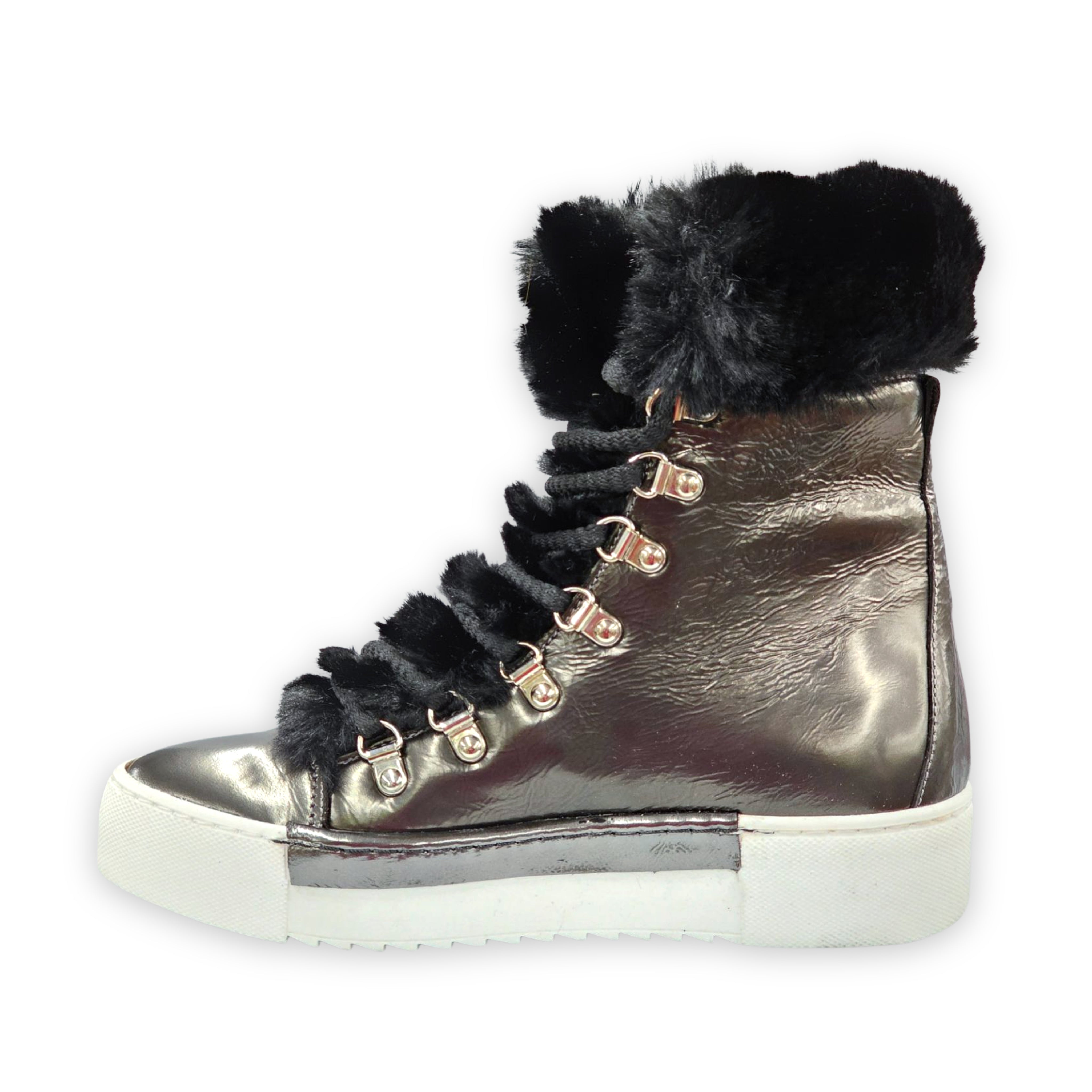Fluffy faux fur gives wintry style and warmth to this hiking-inspired boot set on a serrated sneaker sole.