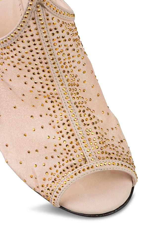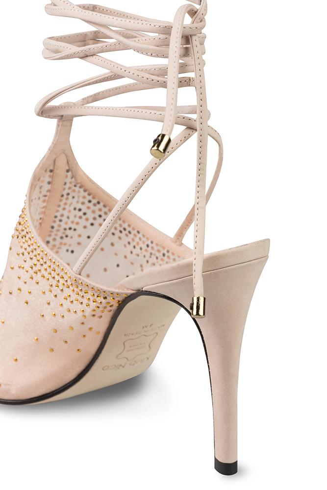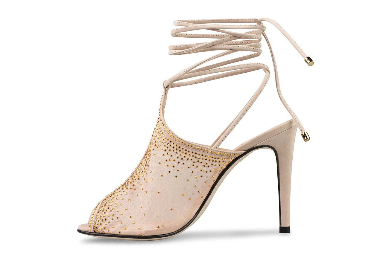 The Margeaux high heel sandal is sexy and stunning! The sheer nude colored mesh is accented by crystals giving the sandal an elegant and sophisticated look. The soft nubuck straps can be wrapped around your ankles and tied either in front, in back or to the side of your ankle depending on the outfit you are wearing. A must this upcoming holiday season.