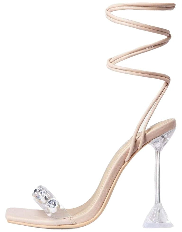 LuxeModa Reina Gem Detail Square Toe Lace Up Clear Perspex Pyramid Heel, NUDE