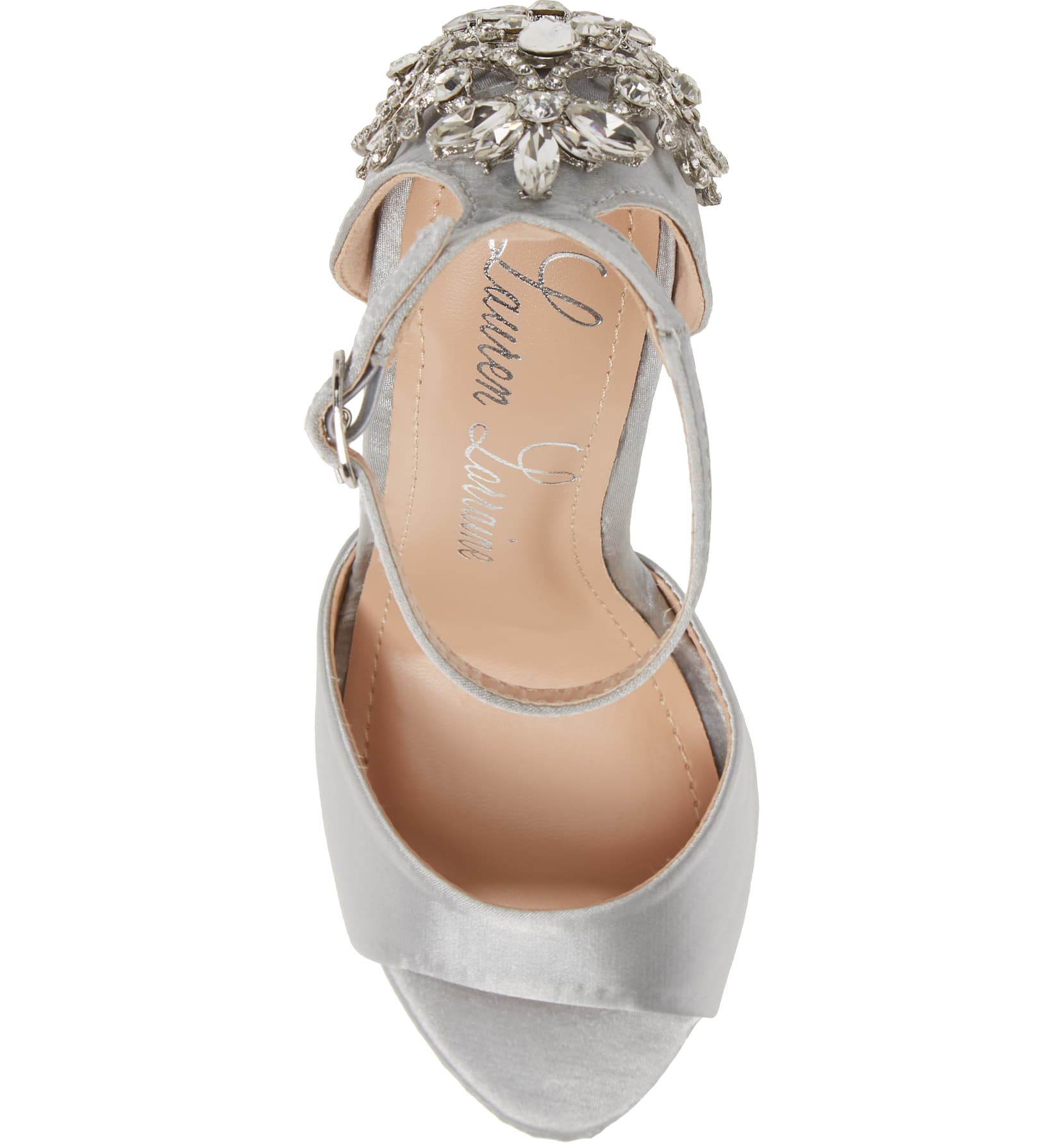 Dazzling crystal flowers twine and bloom at the heel of an elegant ankle-strap sandal made from lustrous satin and perched on a lofty stiletto.