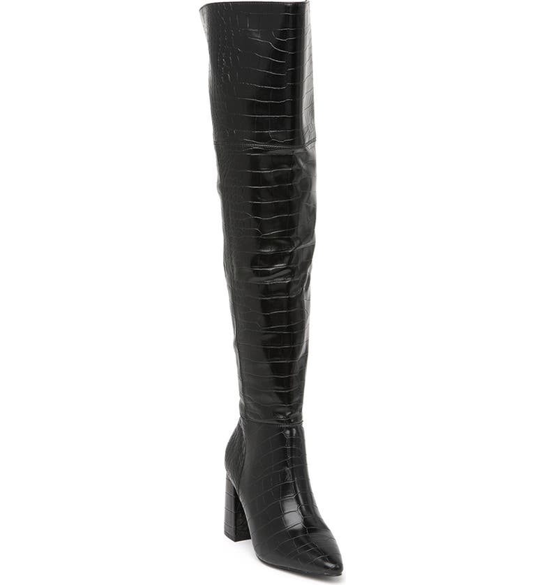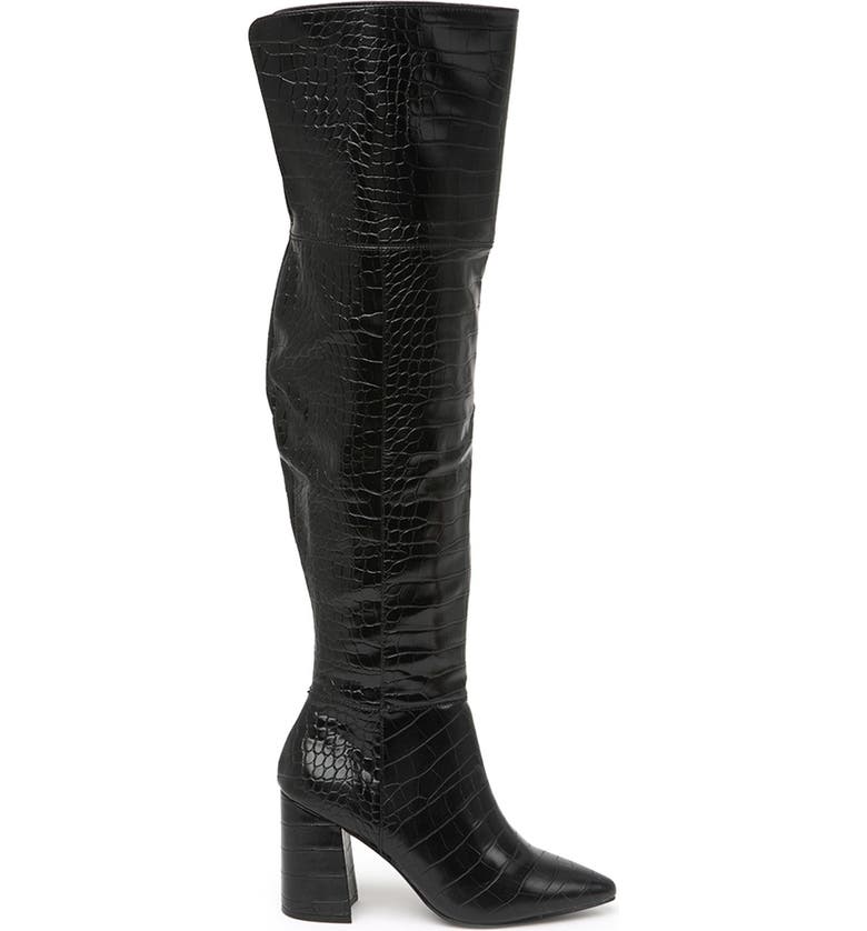 A chic over-the-knee boot features a croc embossed design with a covered block heel for eye-catching style.