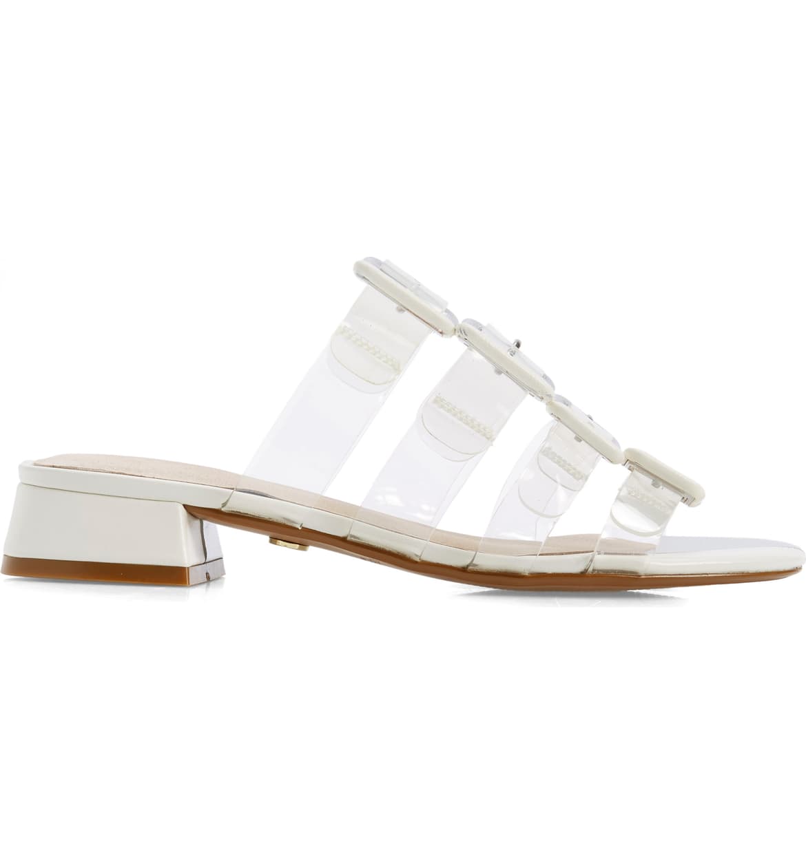 Step out in style with the bold and distinctive design of Lincoln Slide Sandals. Featuring oversized buckles and lucite details, these sandals wrap your feet in a combination of vinyl, leather, and clear lucite plastic for a truly unique look.