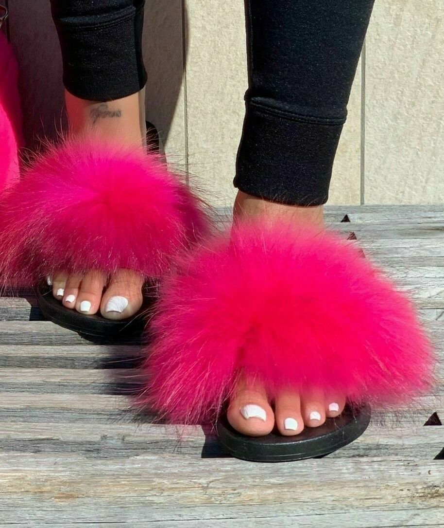 - Flexible slip on open toe style that is easy to wear anytime and anywhere.Fuzzy slippers for women are available in several colors so you can match your style,perfect for all the year round,Featuring a Soft Raccoon Fur Upper.