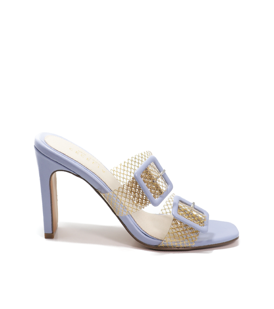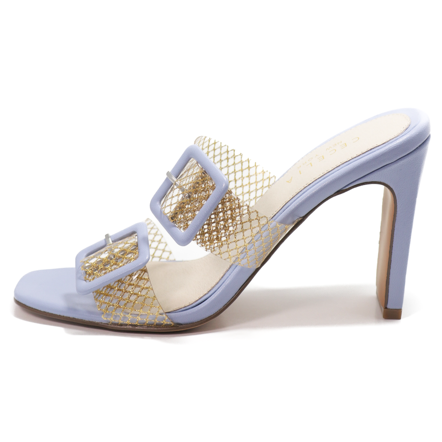 Two-tone buckles pop against the translucent straps of an ultra-chic slide lofted by a slim, rectangular heel.