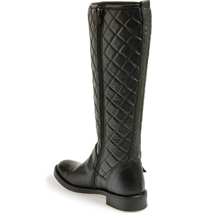 A quilted leather shaft accentuates the sleek silhouette of a knee-high riding boot styled with a buckled ankle strap and a low heel.