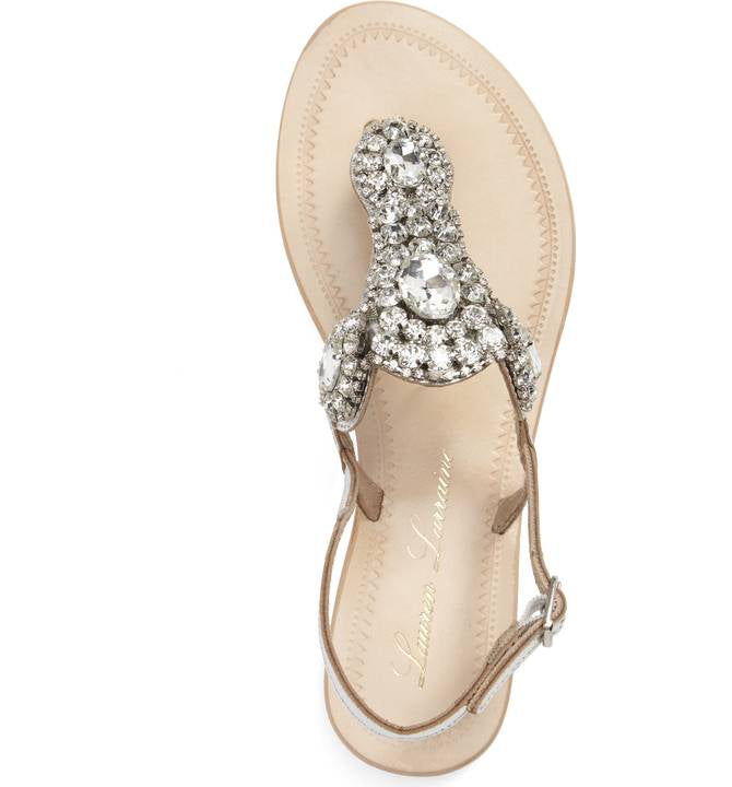 A glittering arrangement of crystals catches and reflects the light on a versatile leather thong sandal that can go from day to evening in a snapperfect for tucking into your beach tote or luggage.