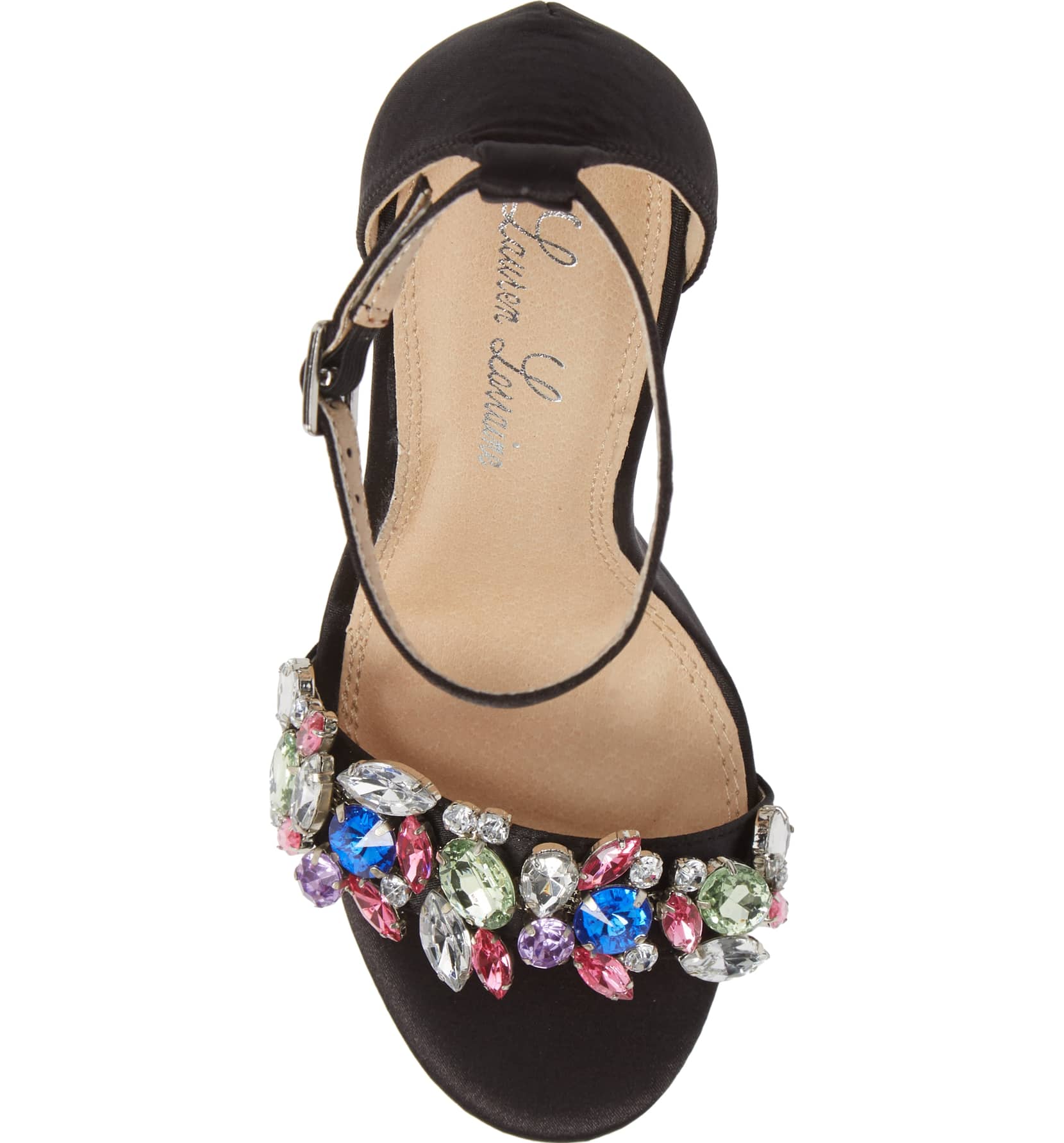 - A treasury of crystal gems adds rich color to a strappy sandal with a playfully chic silhouette