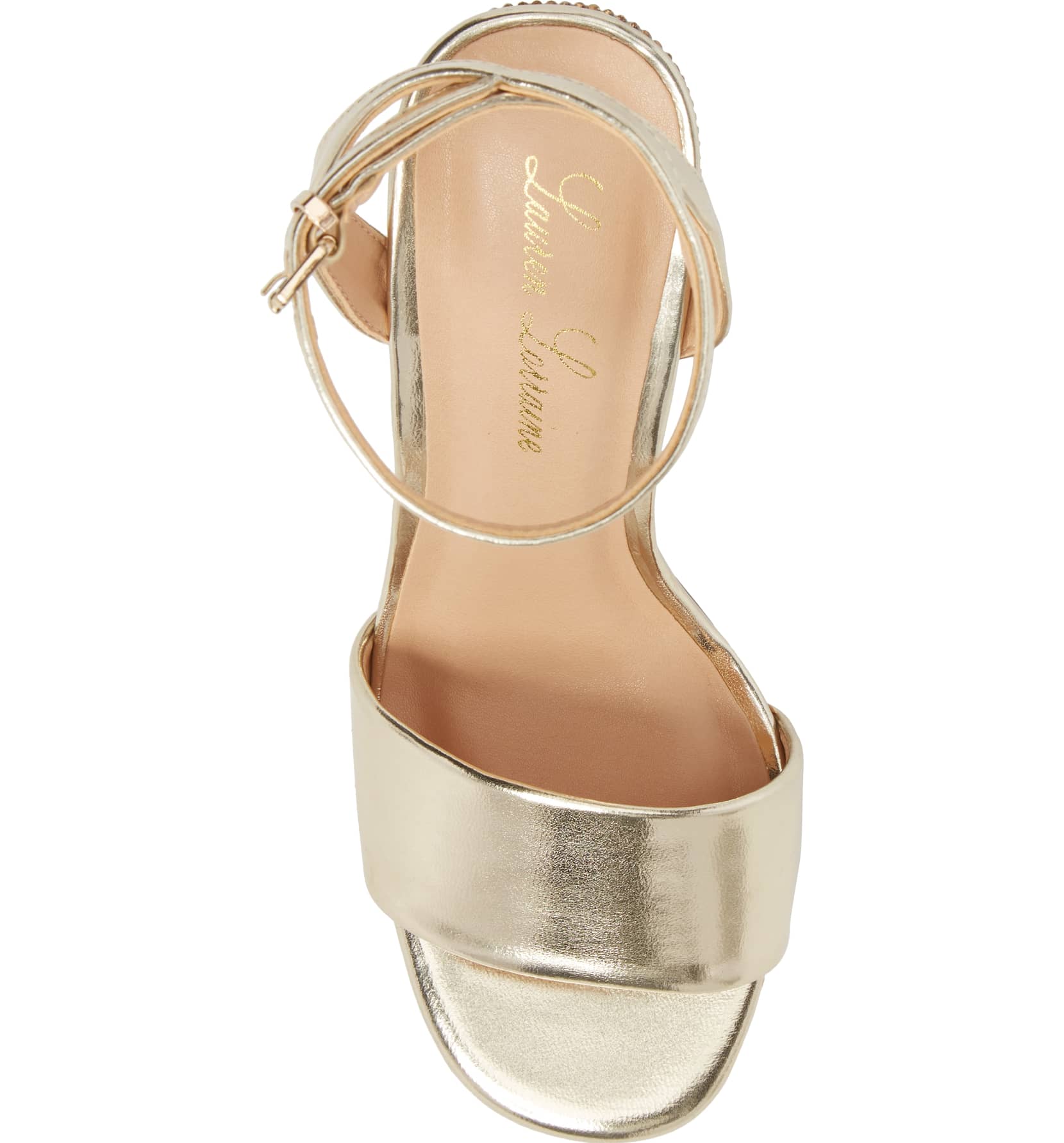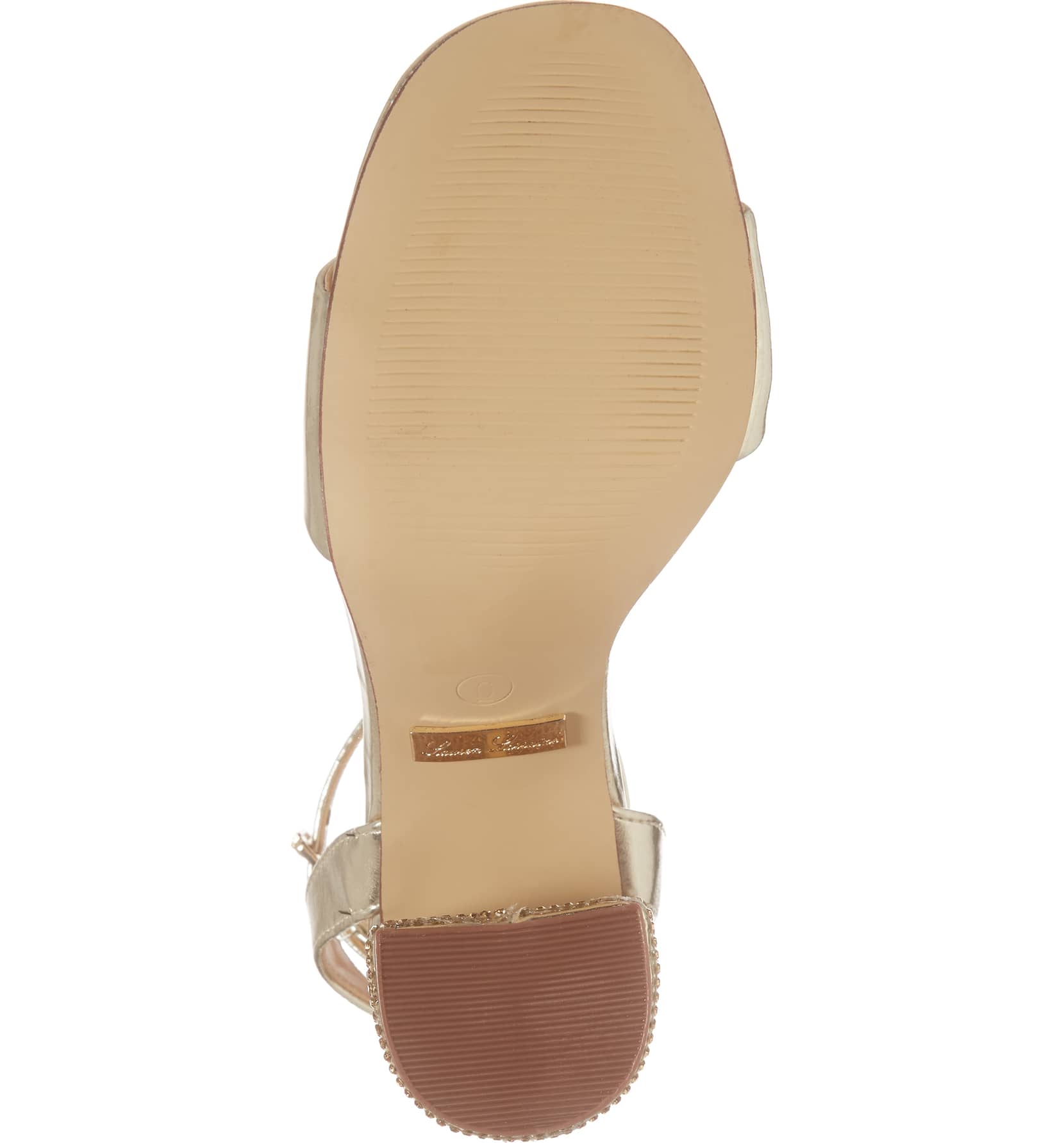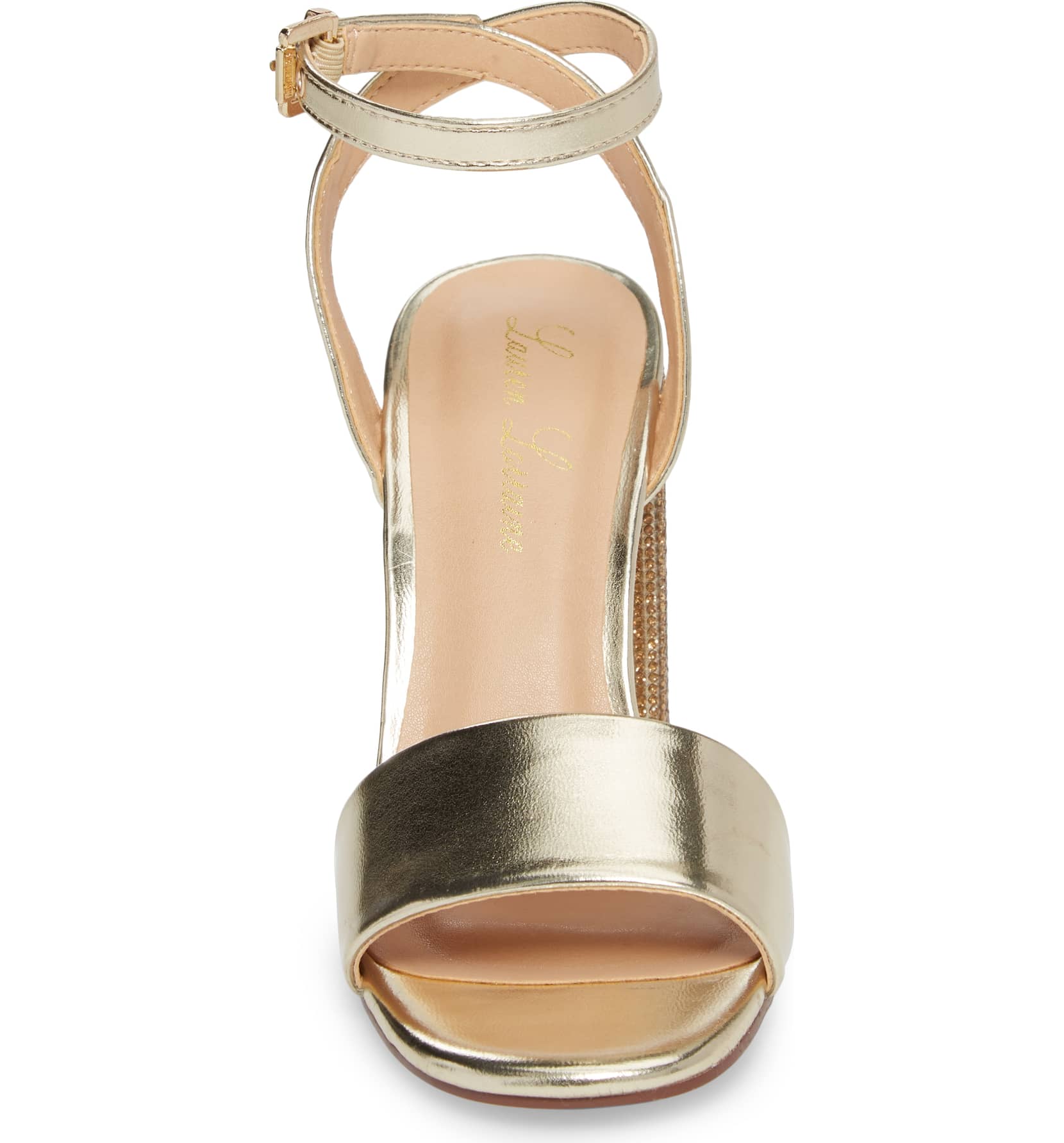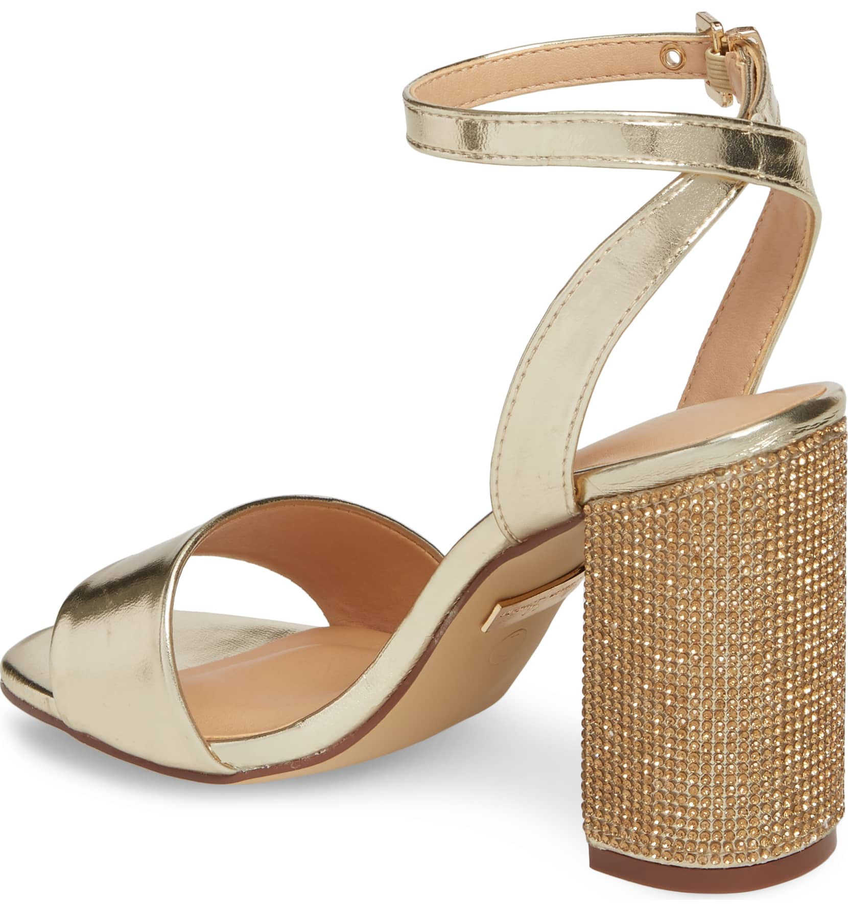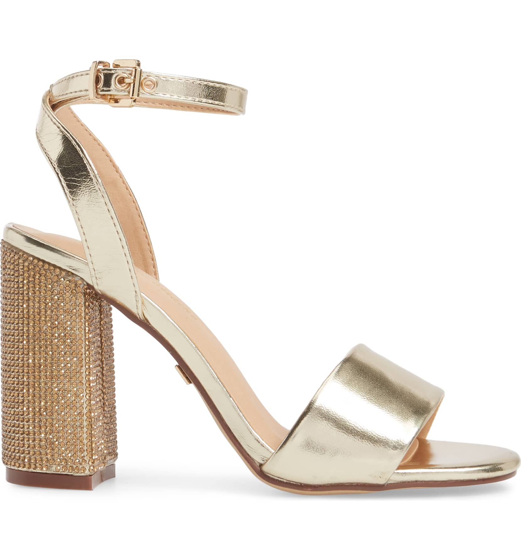 Julia Gold Sandal 3.75 High Heel Mesh Crystal Embellished Dress Pumps - Gold A crystal-encrusted block heel heightens the glamour of an ankle-strap sandal that's ready for a special occasion.