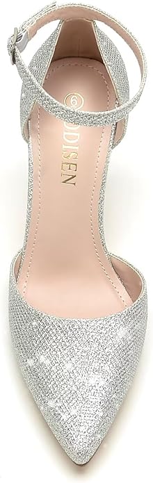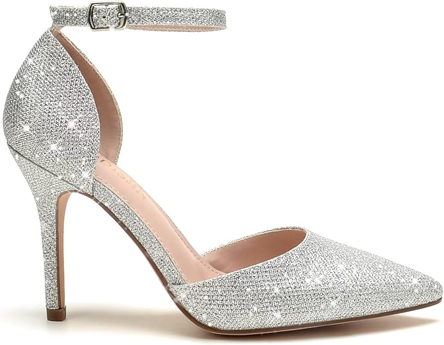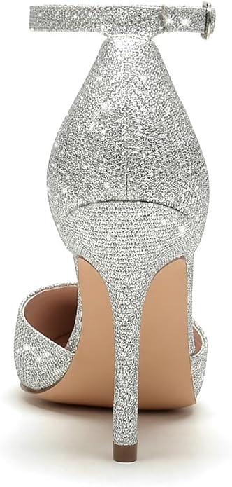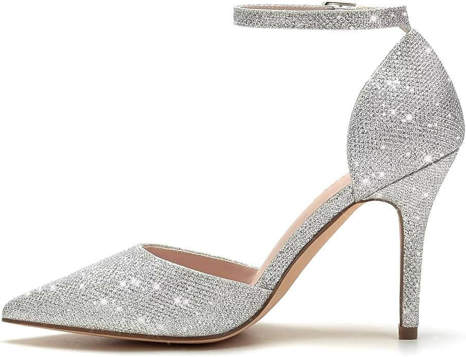 Odisen MS2301 Silver Glitter Fashion Pointed Toe Stiletto Ankle Strap Pumps 10