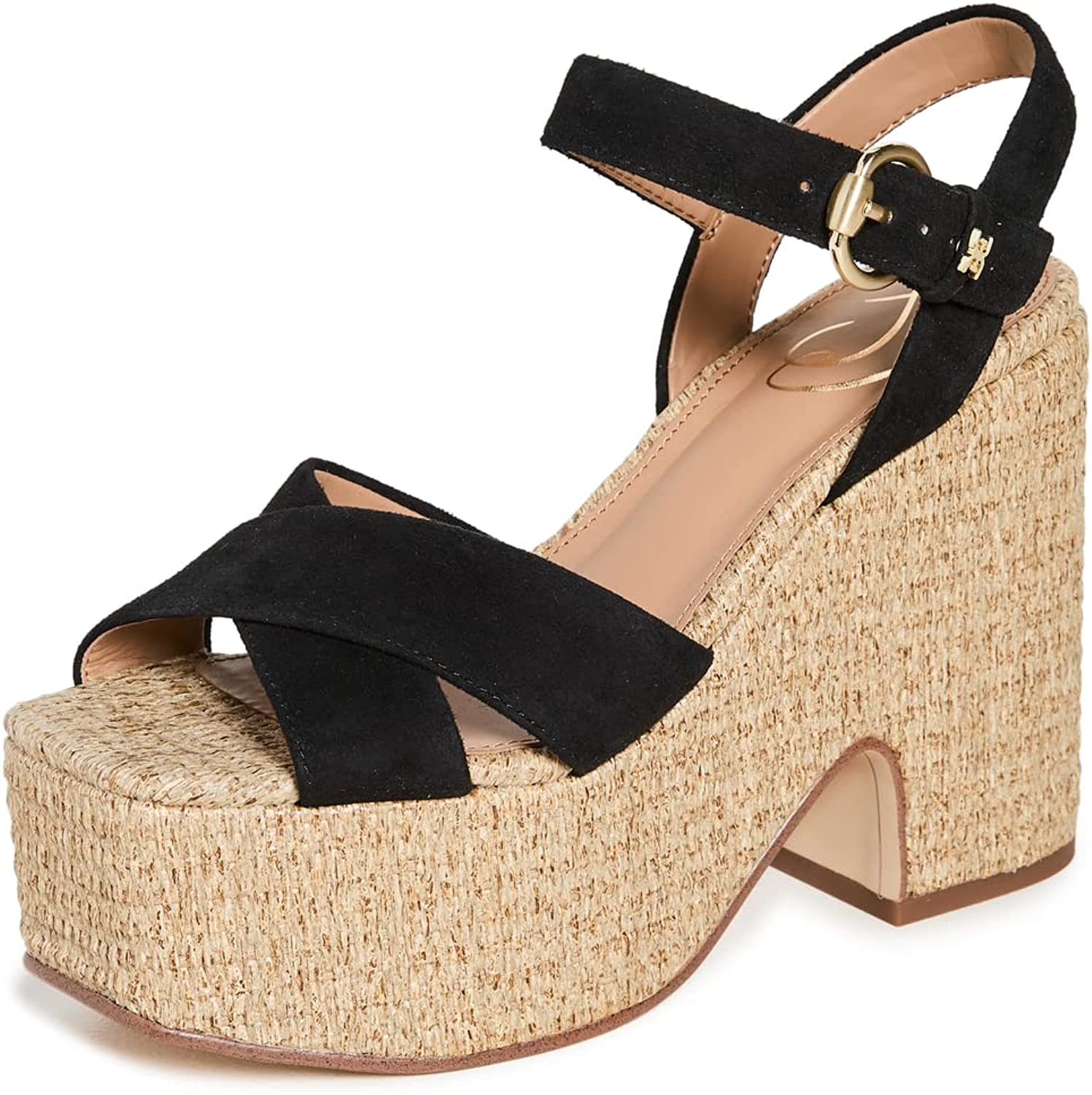 Pump up your summer shoe collection with these platform sandals, which have black suede straps and a chunky midsole with woven trim. Wear yours with anything from sun-bleached denim to floaty dresses and skirts.