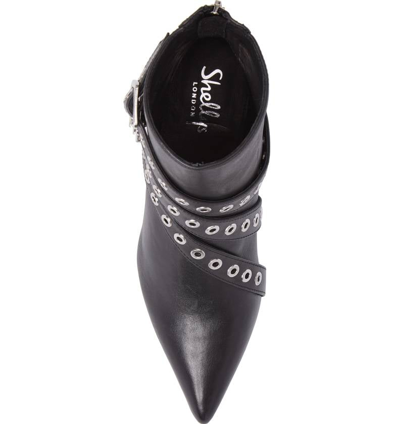 A trio of grommet-studded belts curves across the top of a sleek pointed-toe ankle boot that's lifted by a sculptural angled block heel for contemporary edge.