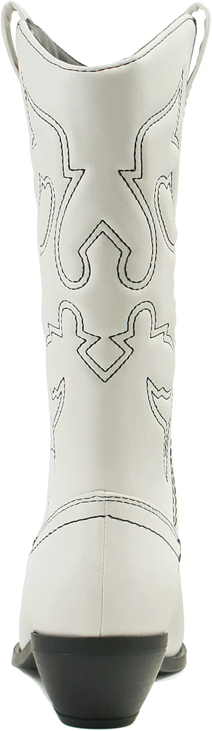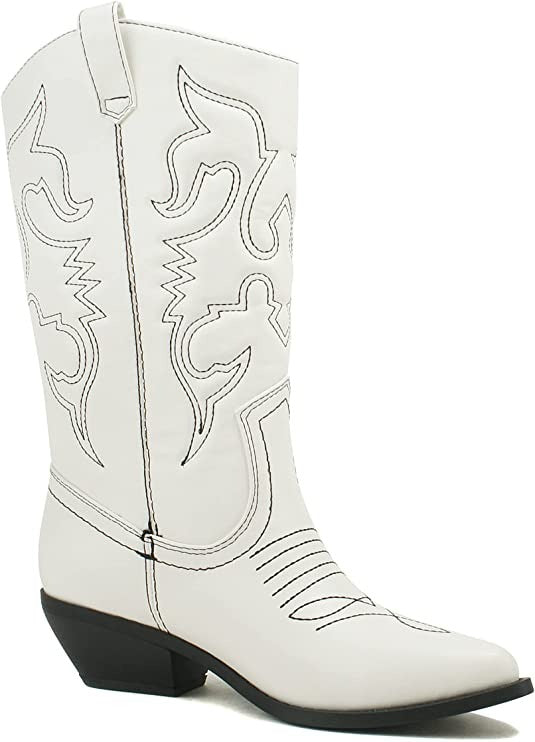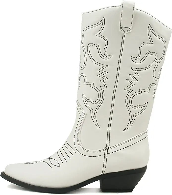 Product Detail : These boots featurs a unisex western cowboy/cowgirl inspired silhouette, side pull tab, pointed toe, low chunky block heel, faux stacked wood, angel wing stitch embroidered shaft and lightly padded insole. Choose from solid and animal prints, the boots is displayed in women's size but the design is suitable for all gender.