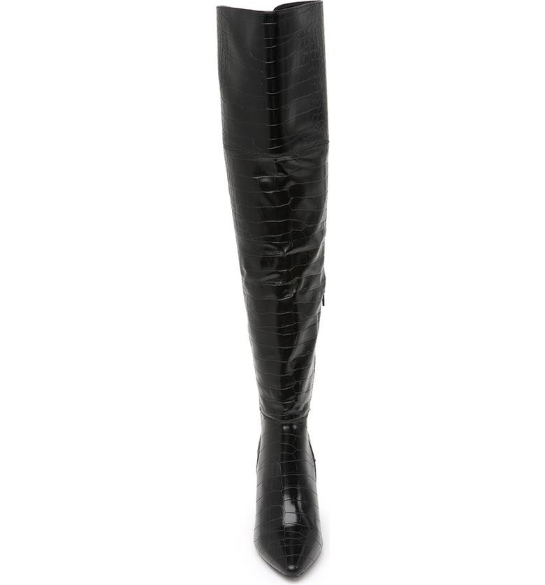 A chic over-the-knee boot features a croc embossed design with a covered block heel for eye-catching style.