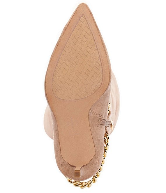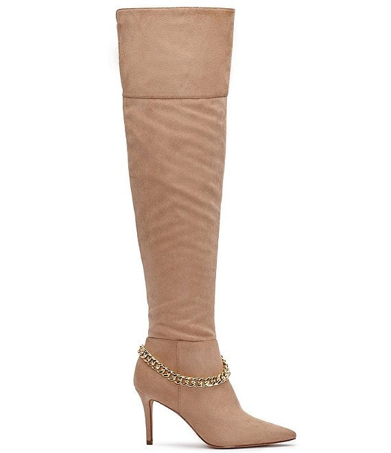 - A chunky chain embellishes this over-the-knee boot designed with a stiletto heel, pointy toe and smooth leather lining.
