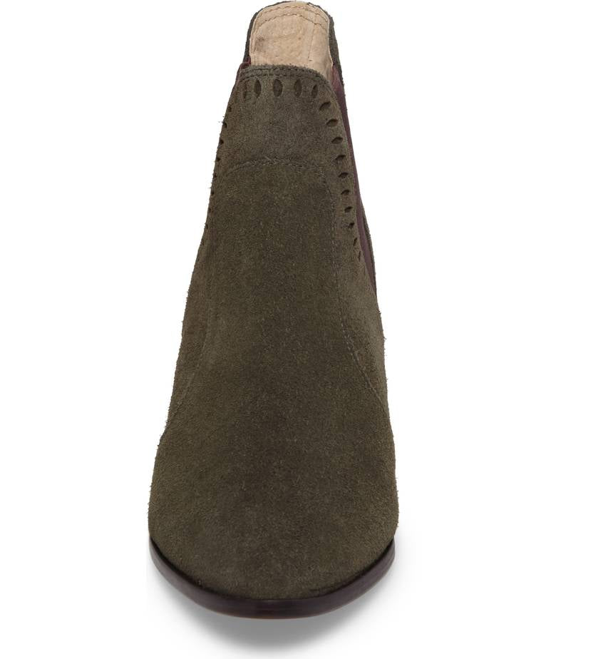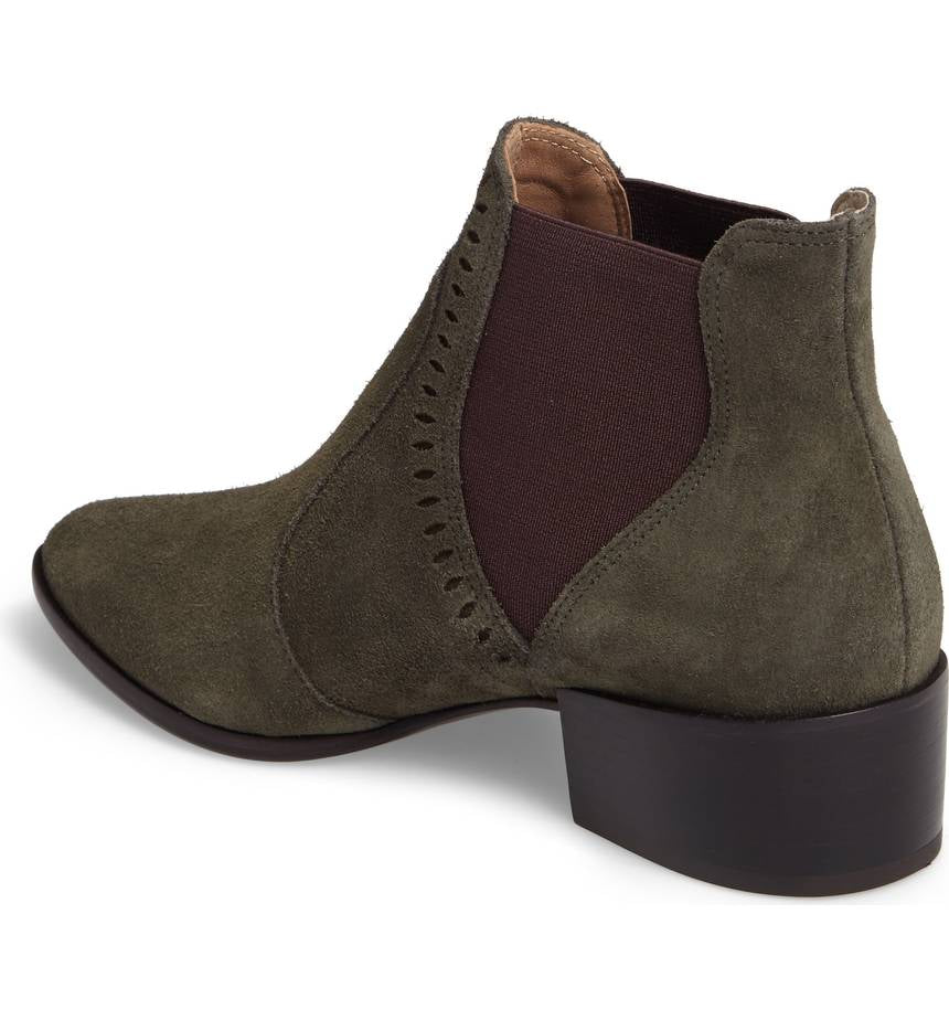 curvy goring panels and diamond-shaped perforations bring shape and texture to an updated pointy-toe Chelsea bootie grounded by a chunky stacked heel.