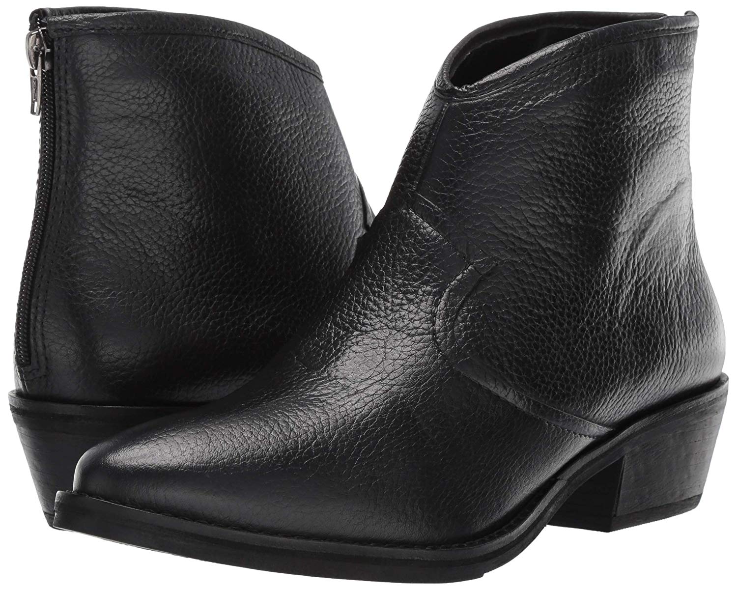 A gently curved topline updates a classic leather bootie with an almond toe and modestly stacked heel.