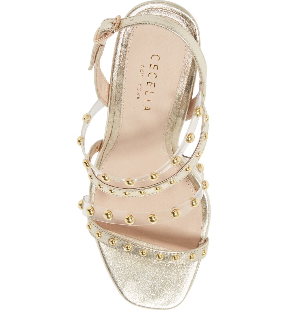 Golden rounded studs punctuate the two-tone straps of an asymmetrical sandal lofted by a towering rectangular heel.
