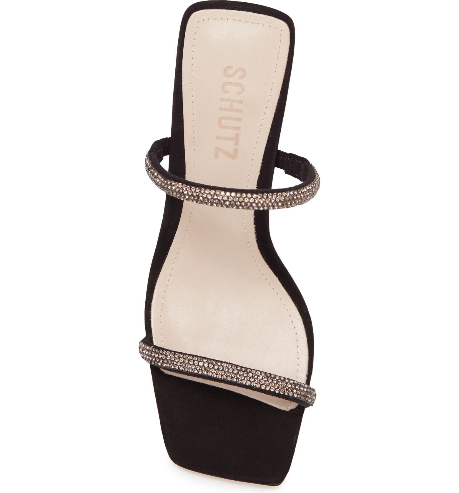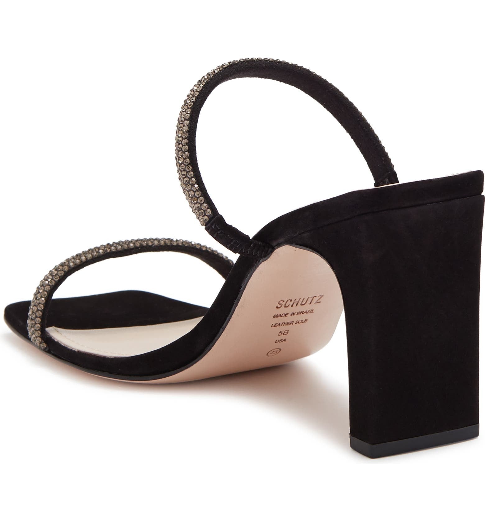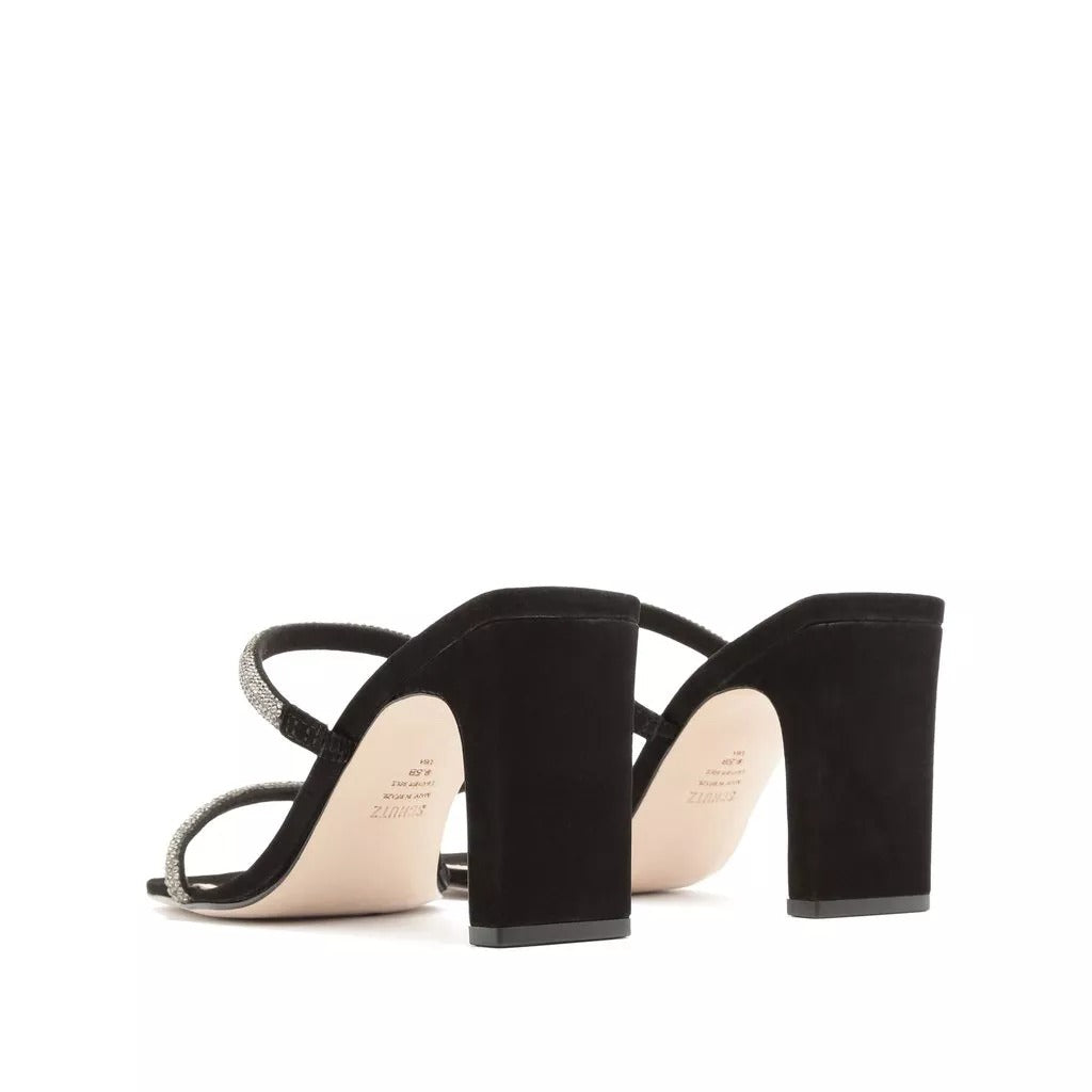 Schutz Salwa Black Suede Rhinestone Open Toe Thin Strap Mid Heel Mule Sandals
