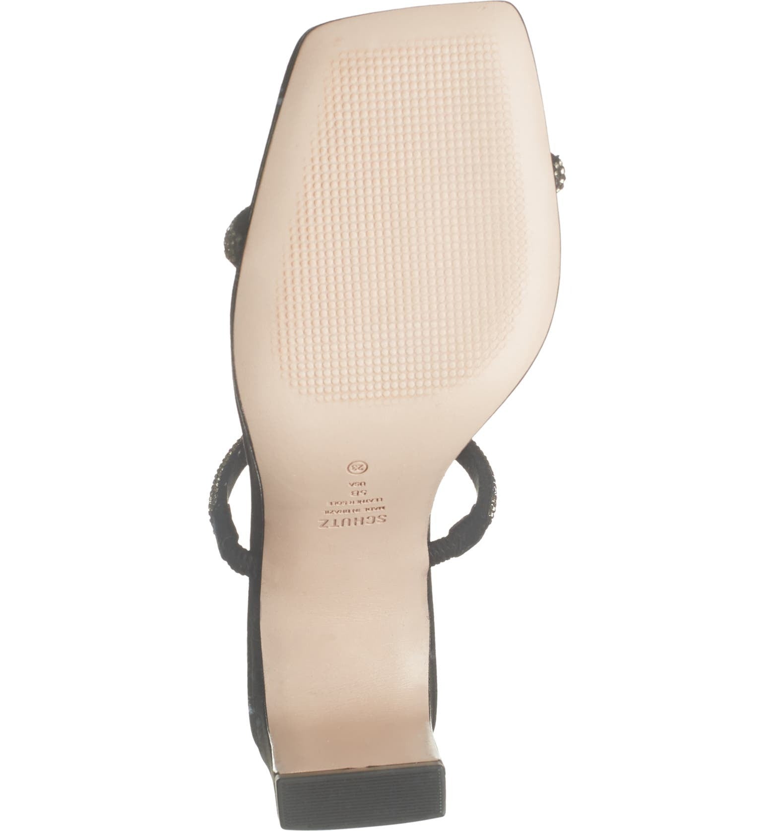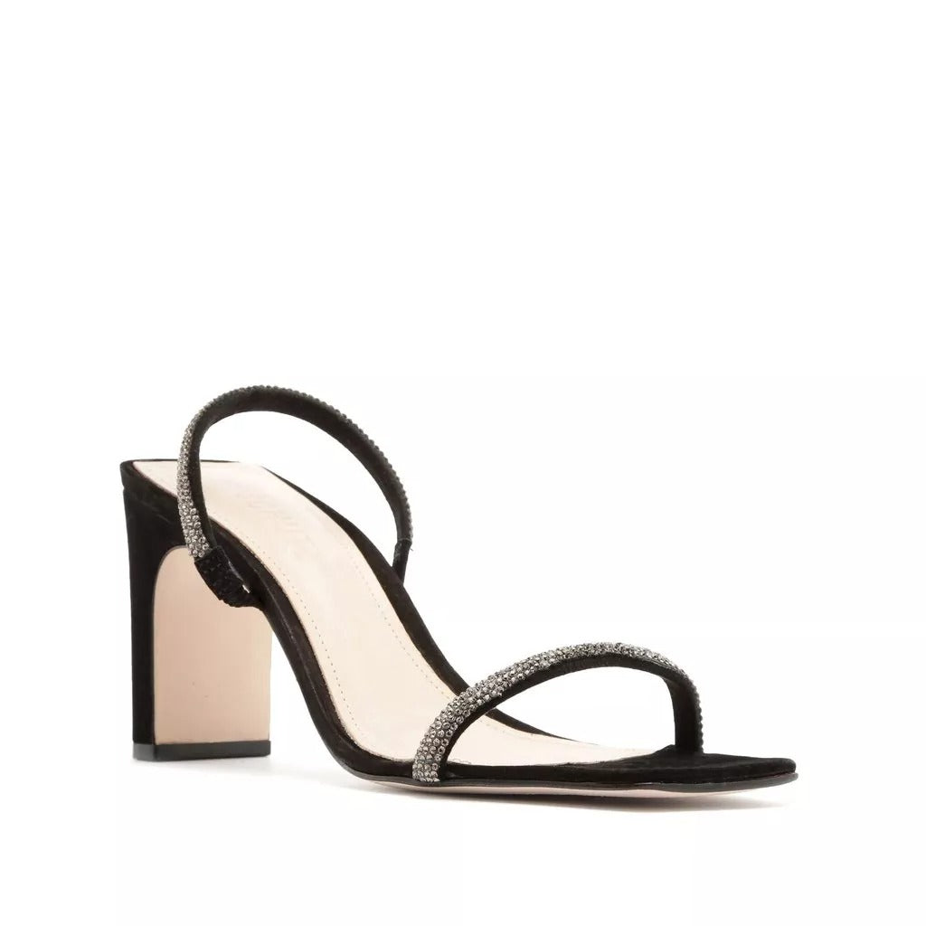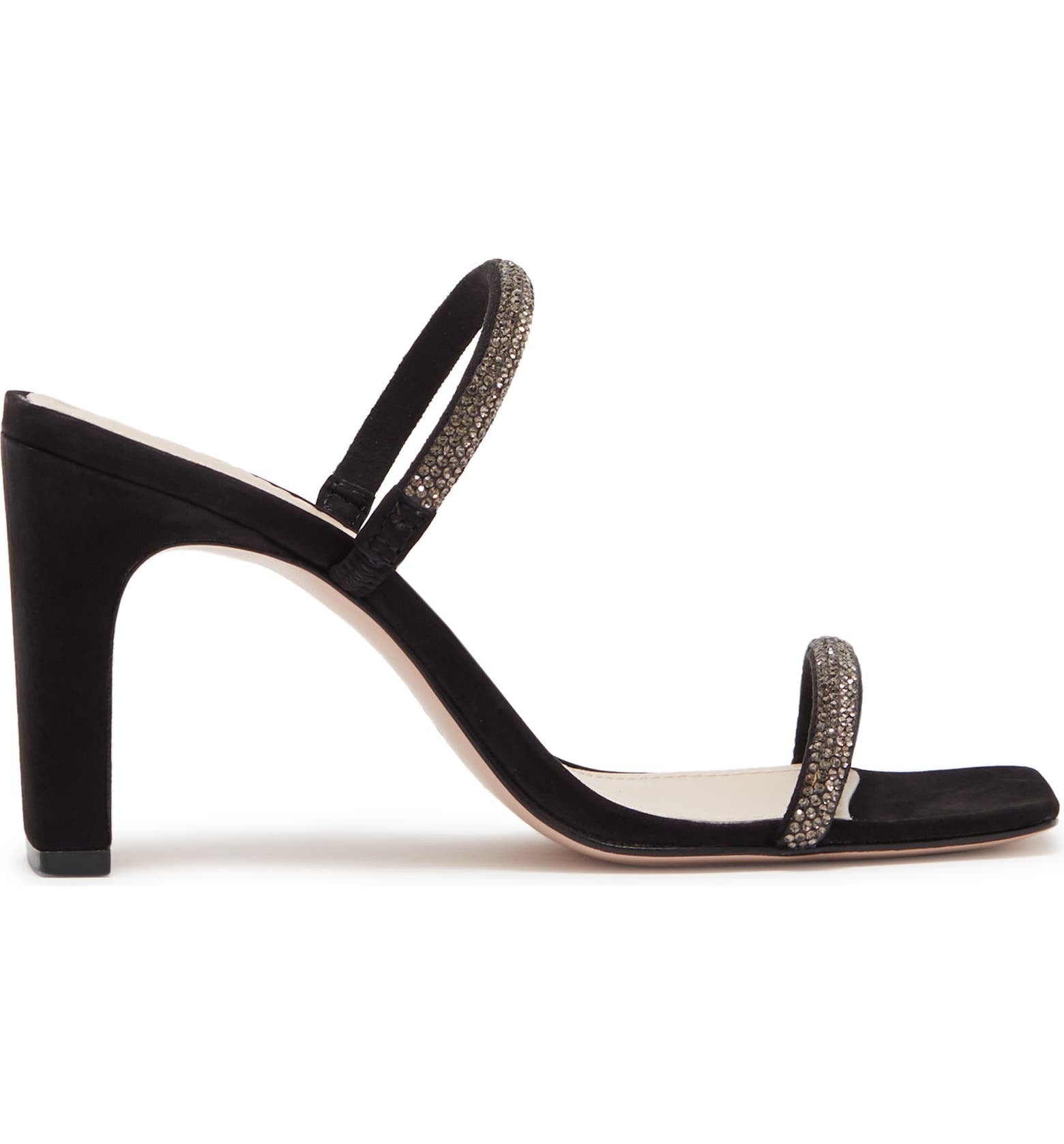 Schutz Salwa Black Suede Rhinestone Open Toe Thin Strap Mid Heel Mule Sandals