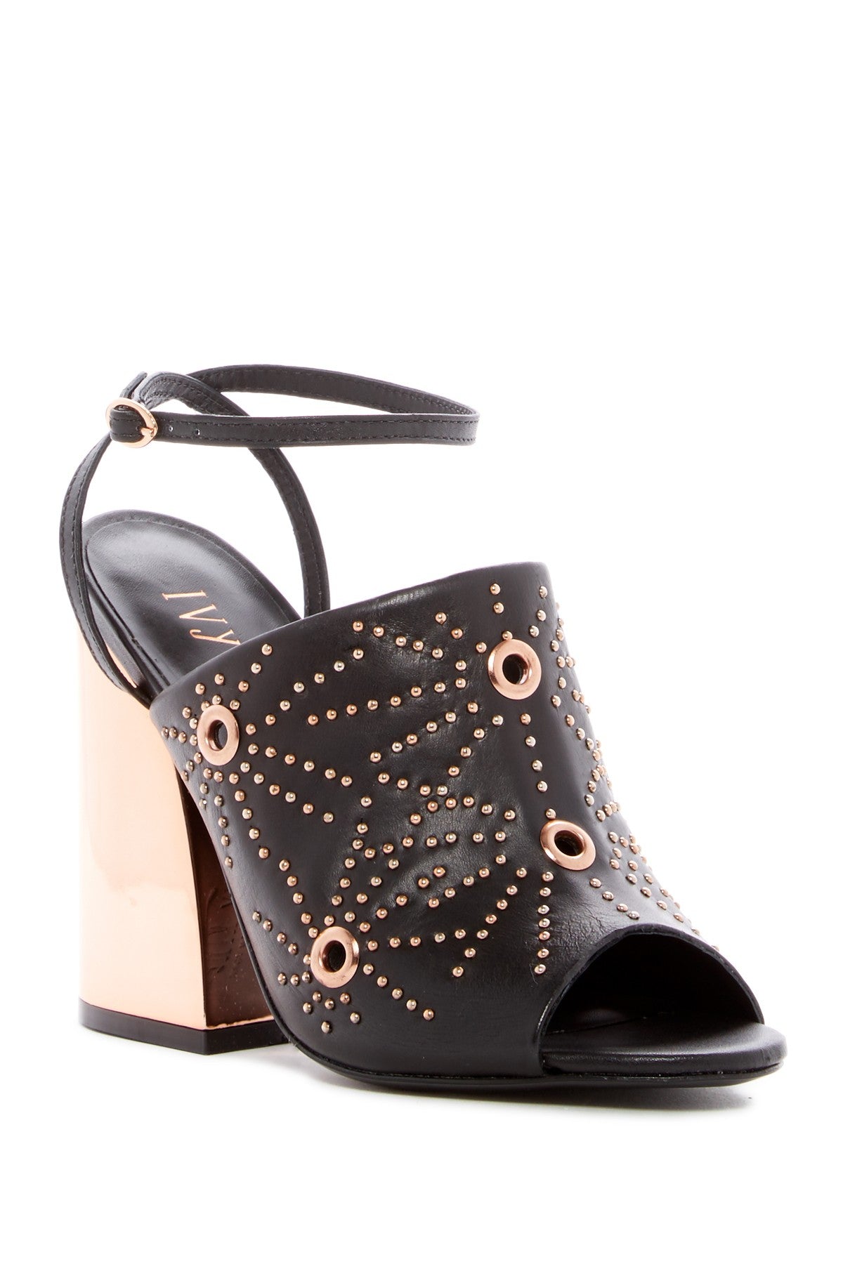 Elegance and punk come together for this unexpected peep-toe mule. This mirrored block heel style features a firework motif of strategically placed rivets and studs