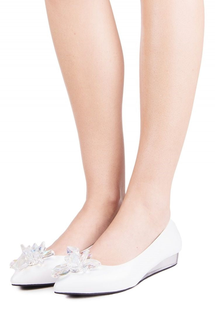 JACY-CRYS flats are constructed from various top quality materials, including box leather upper, leather lining, clear manmade wedge heels, and premium rubber soles.