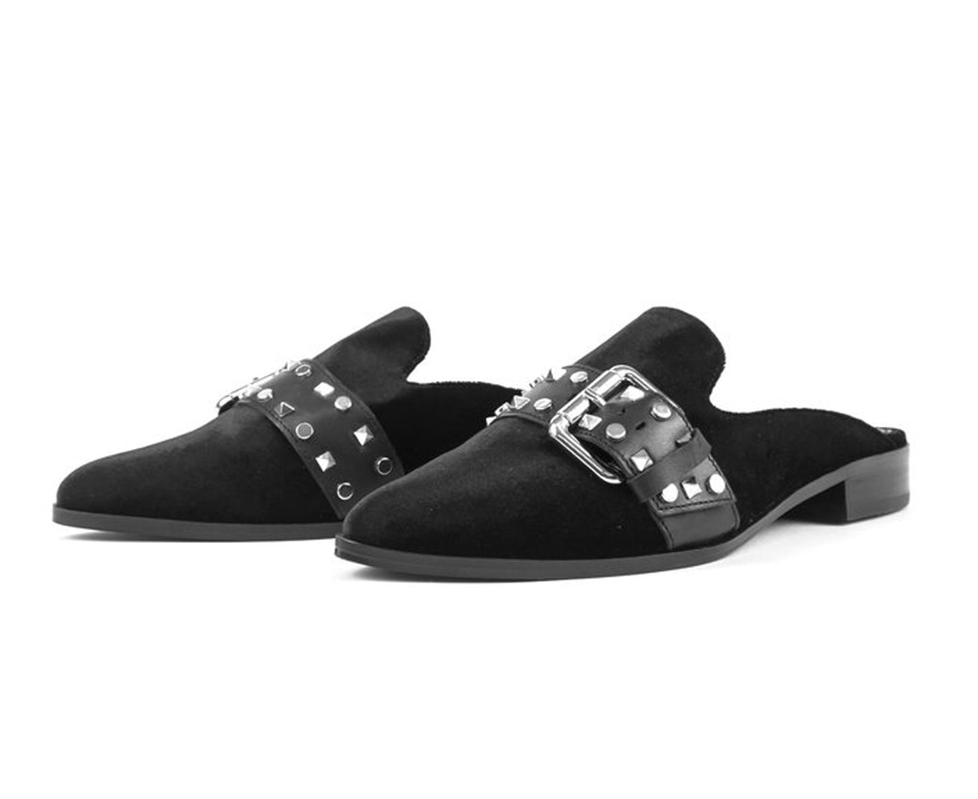Shellys London Elon Black Velvet Flats Mules Slides Pointed Toe Buckle Slip On