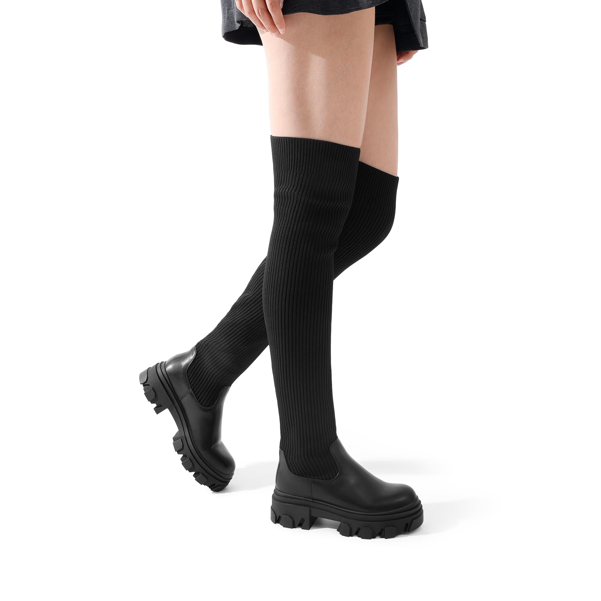 - The stretchy knitted upper on these thigh-high boots for women allows for easy on and off while providing a snug fit that keeps your legs cozy and warm during the cold months.