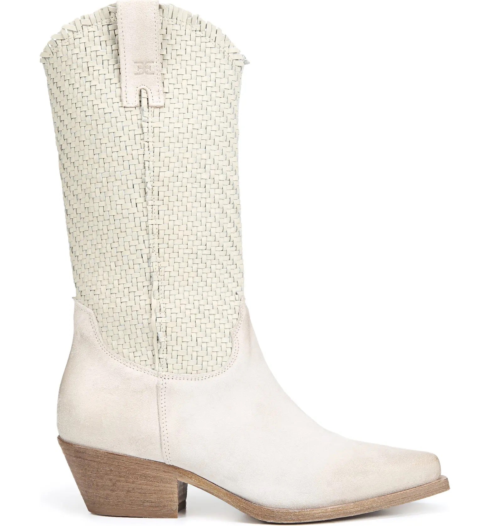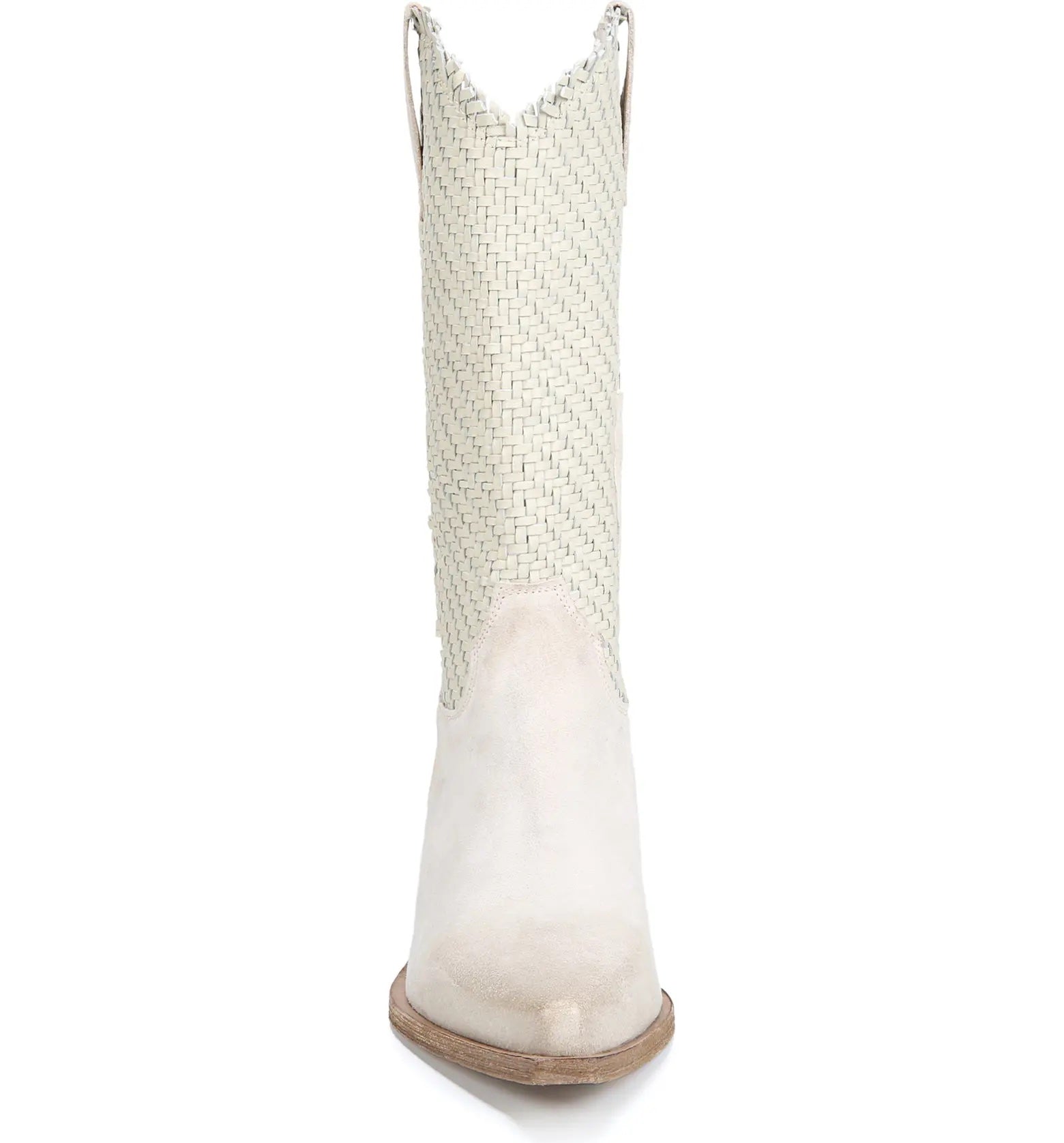 Sam Edelman Brenda Off White Stacked Heel Pointy Toe Woven Mid-Calf Western Boot