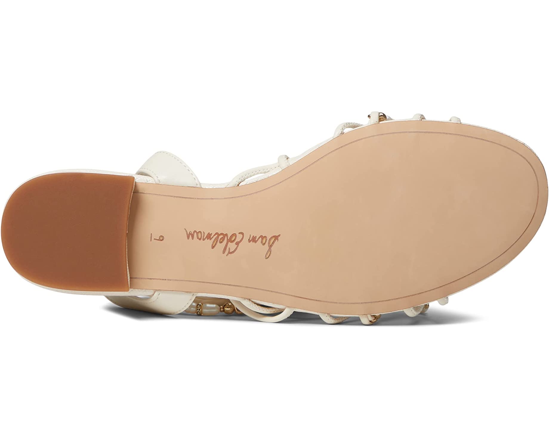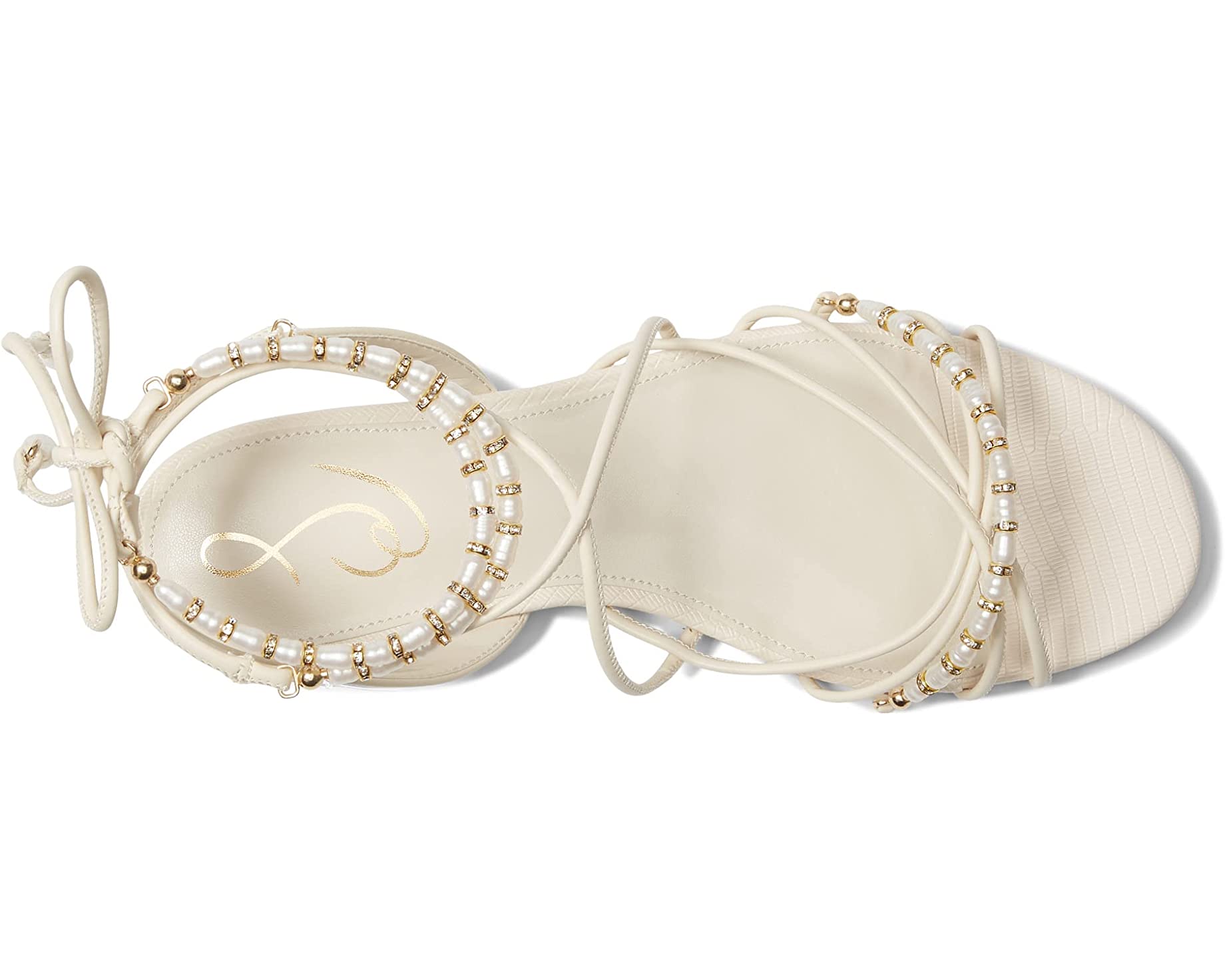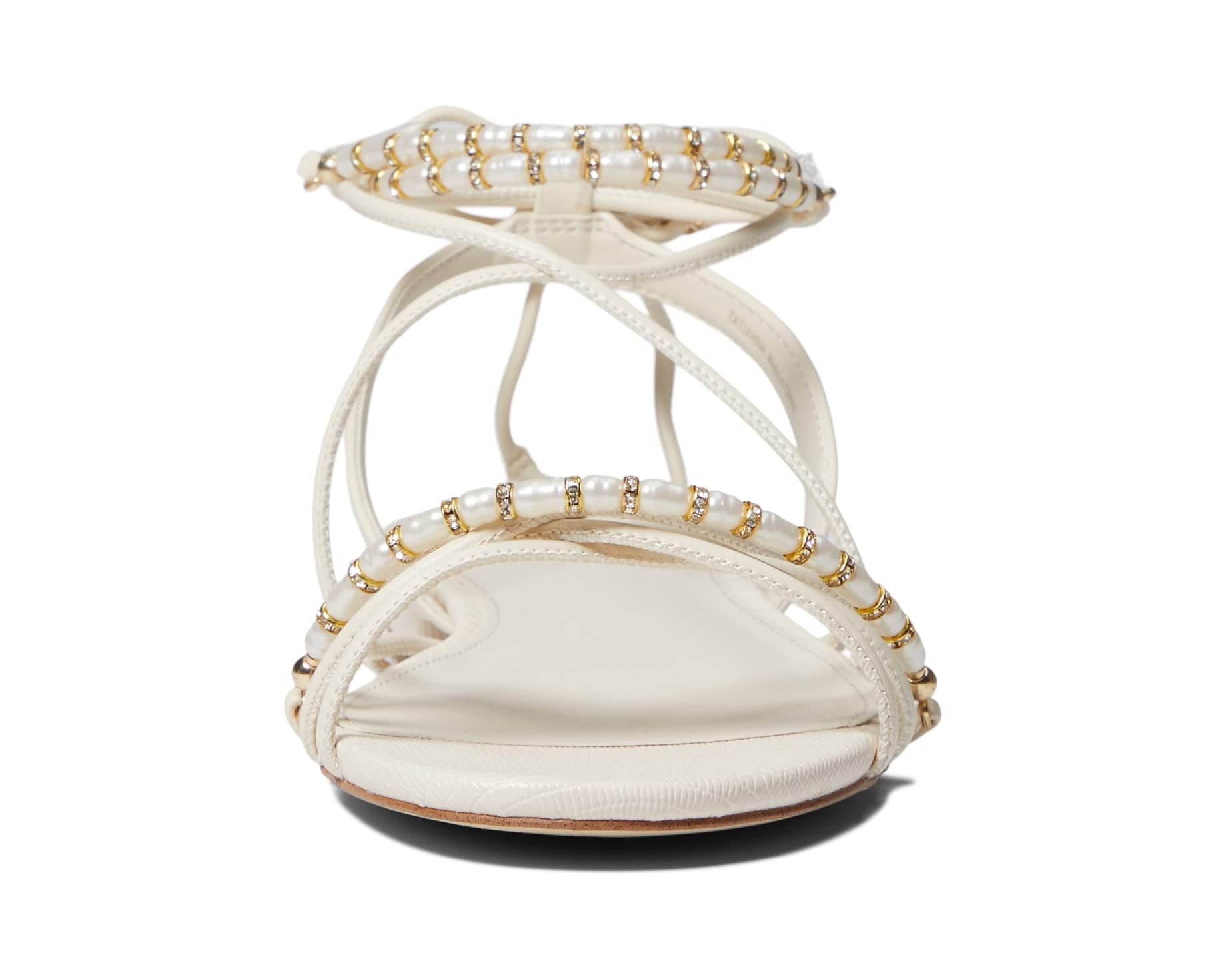 - Strappy upper embellished with beads and shimmery hardware.