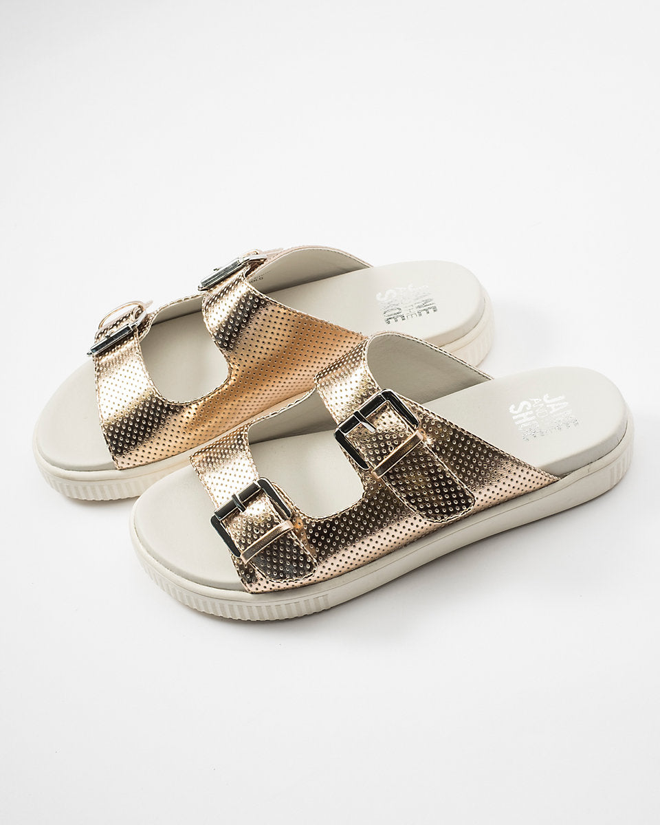 Sizing: True to size. Standard width. Whole sizes only; for 1/2 sizes, order next size down. - Open toe - Synthetic upper - Perforated details - Double buckle strap on vamp - Slip-on style - ImportedMaterialsSynthetic upper, manmade sole