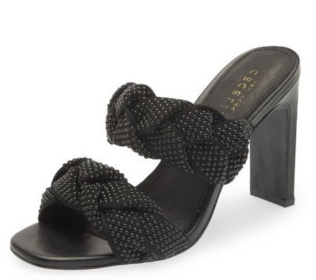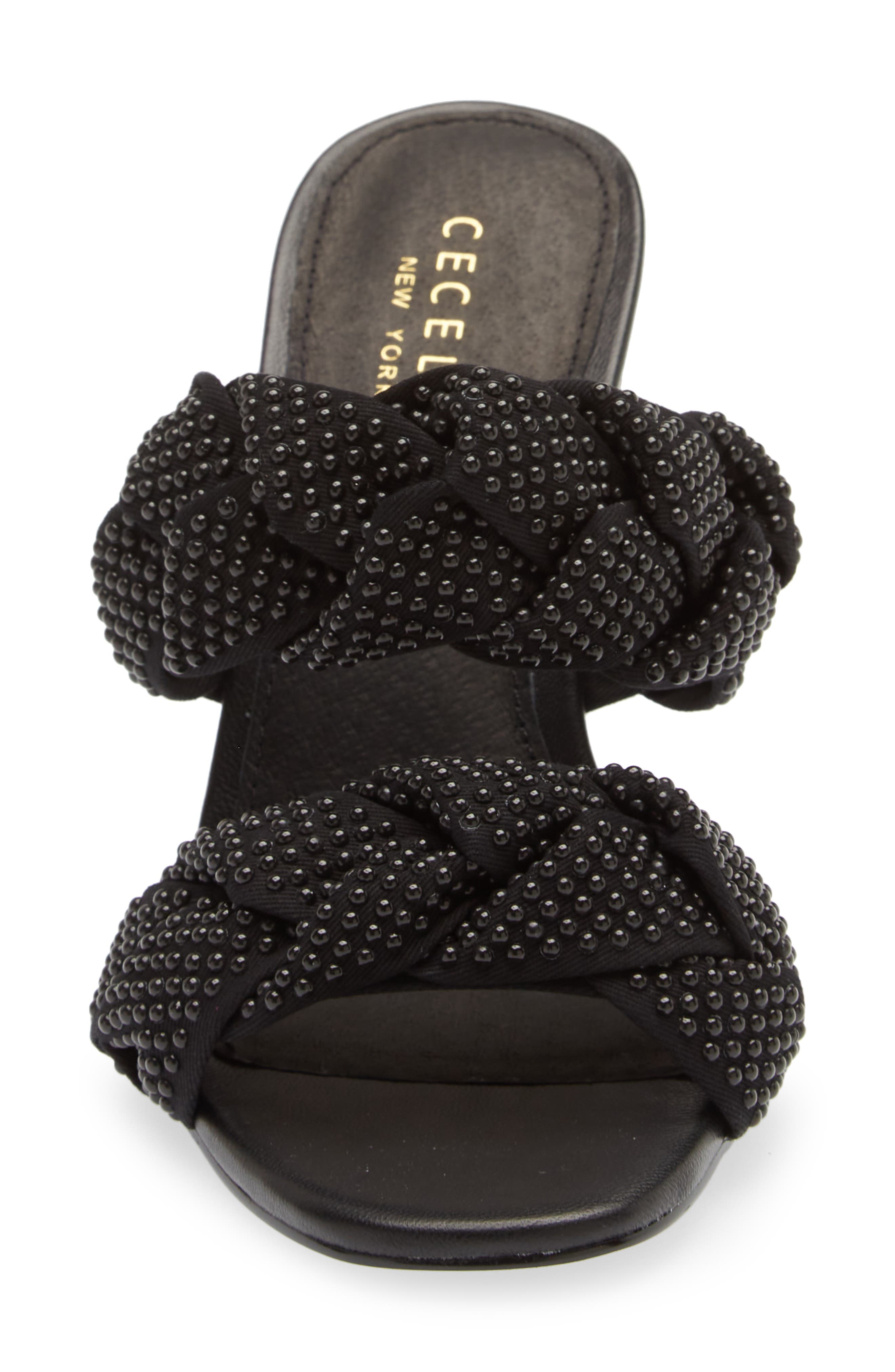 Dainty beads embellish the braided vamp straps of a charming sandal lifted by a contemporary shaved block heel.
