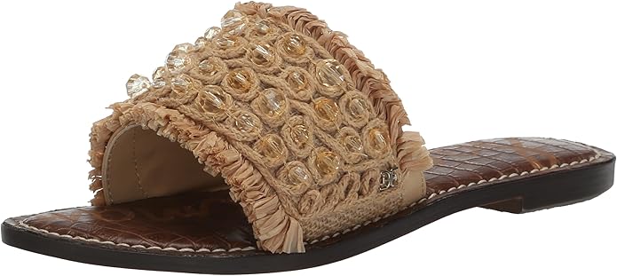 Feminine details abound in the uber glam Gladys slide with eyelet beading and raffia eyelash trim. Make your maxi dresses look even more carefree!
