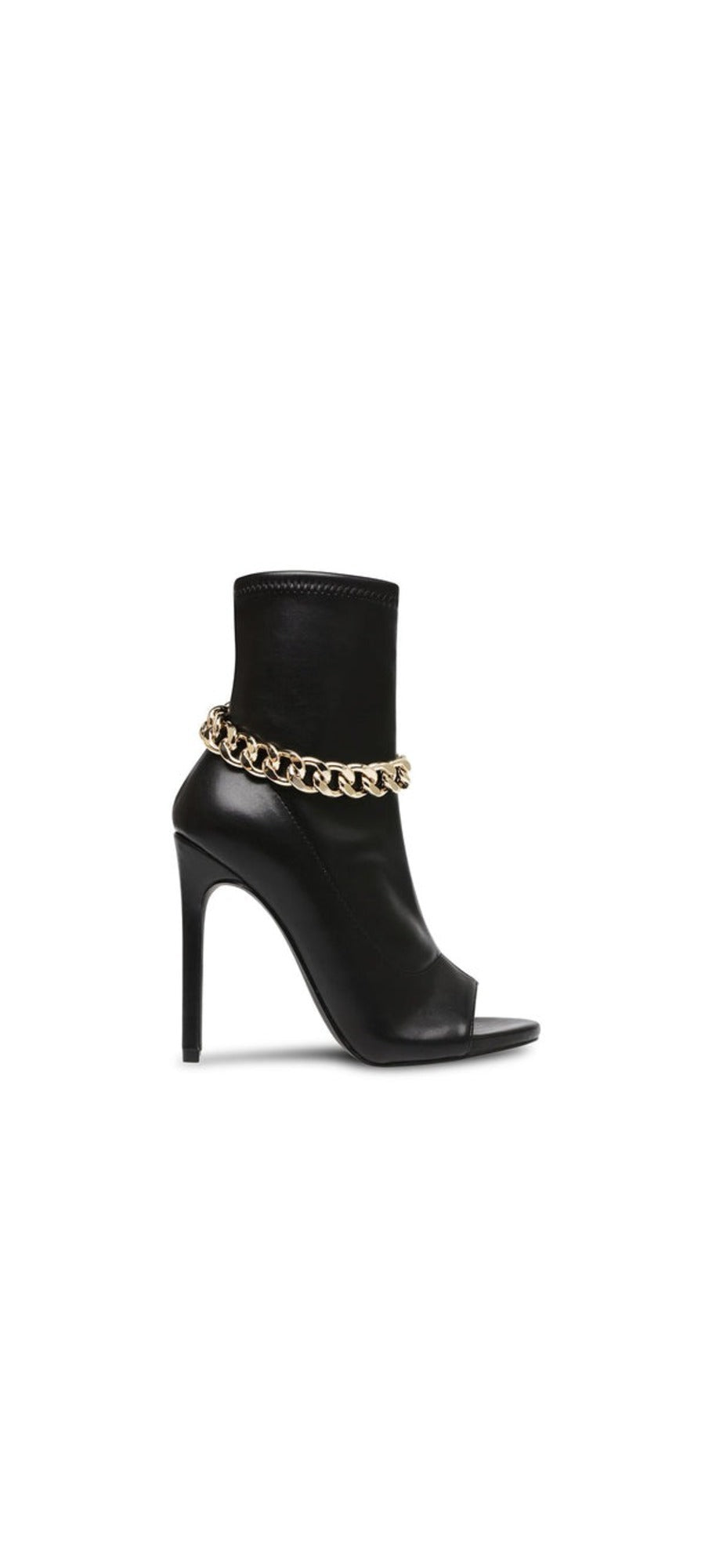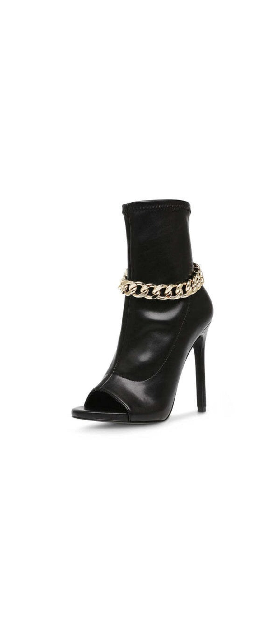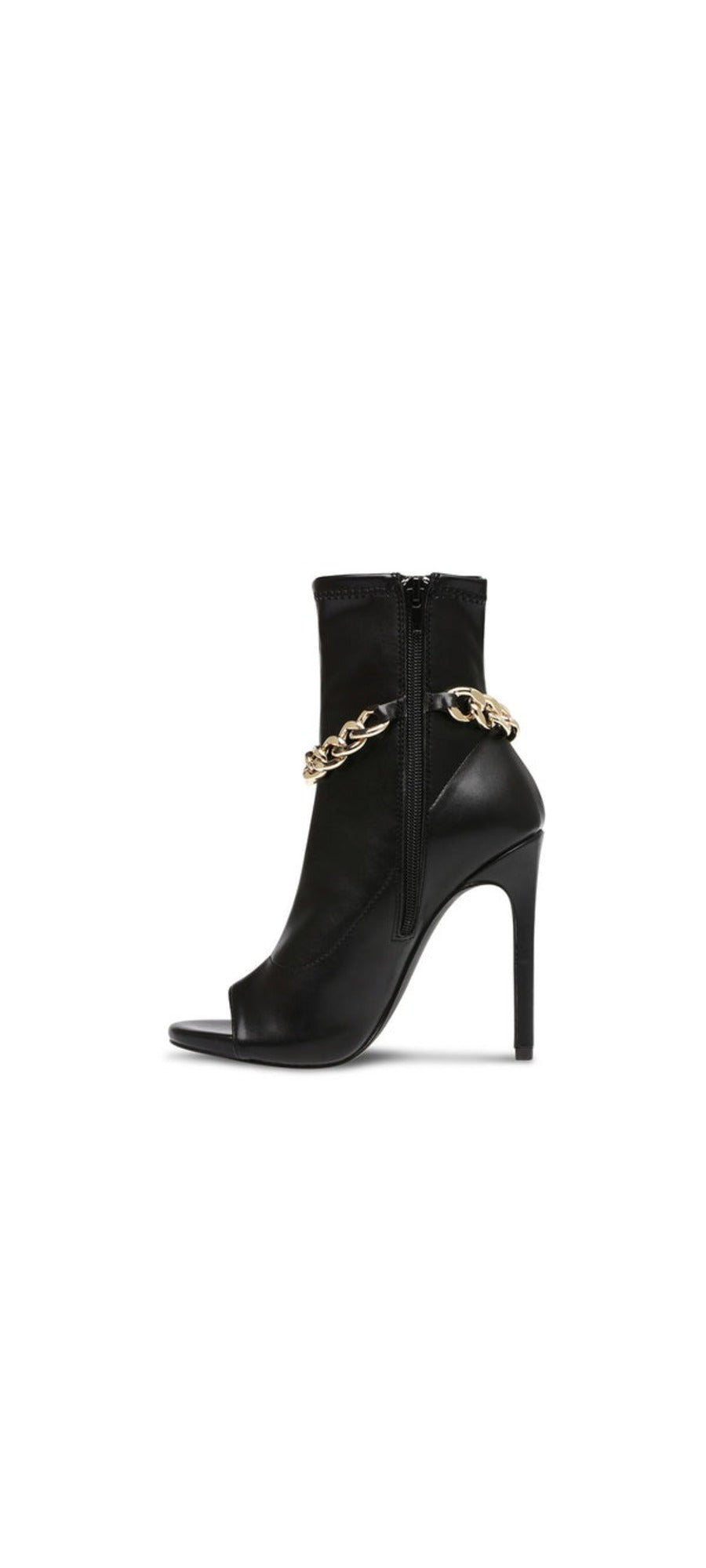 Look smokin hot in ELETTRA-C, a sexy open-toed boot. Set on a towering stiletto heel, this pair is styled with gold chain hardware for added glam.
