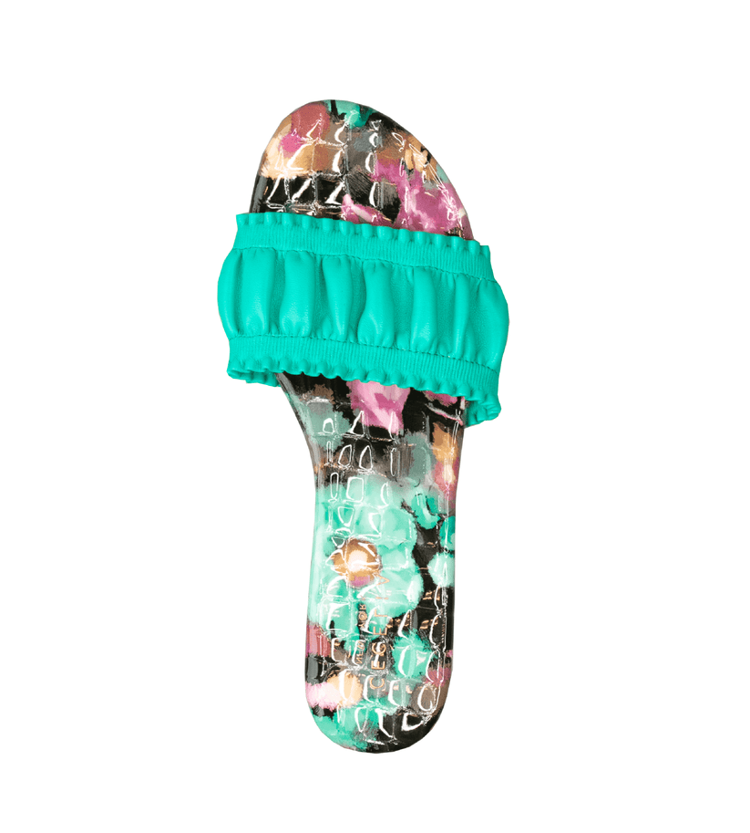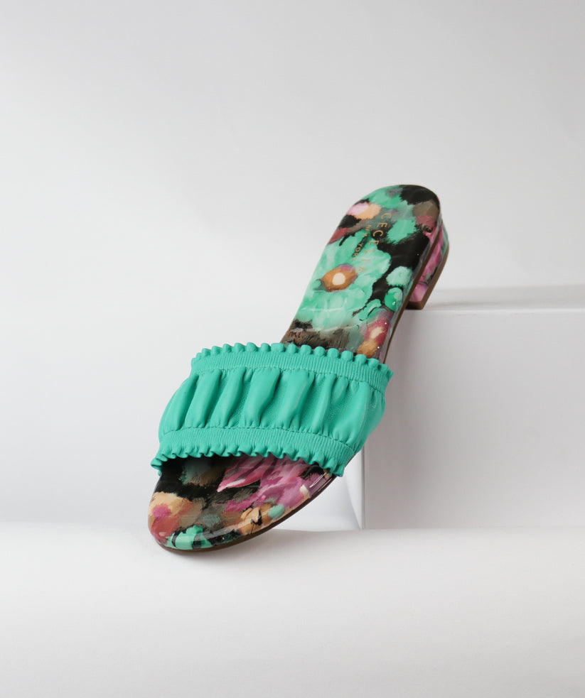 - The leather ribbon upper adds a chic touch to the classic slide sandal design.