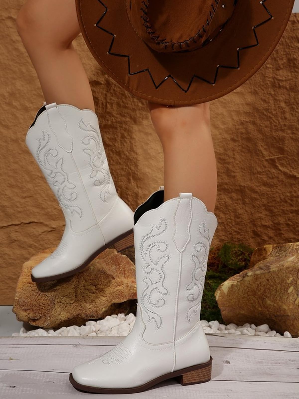 Cowboy LT White Embroidered Chunky Heel Western Wide Calf Fashion Classic Booties 6