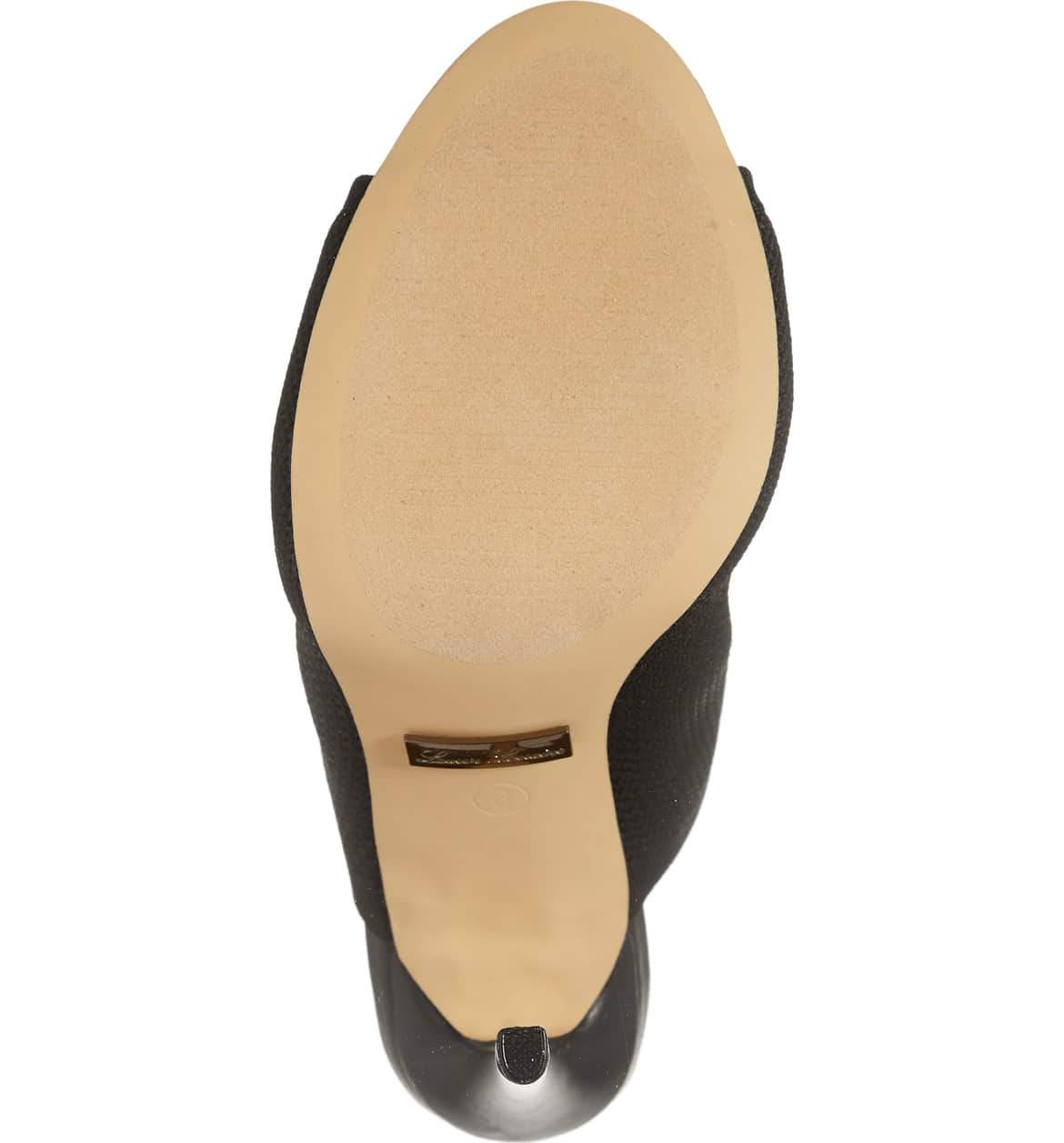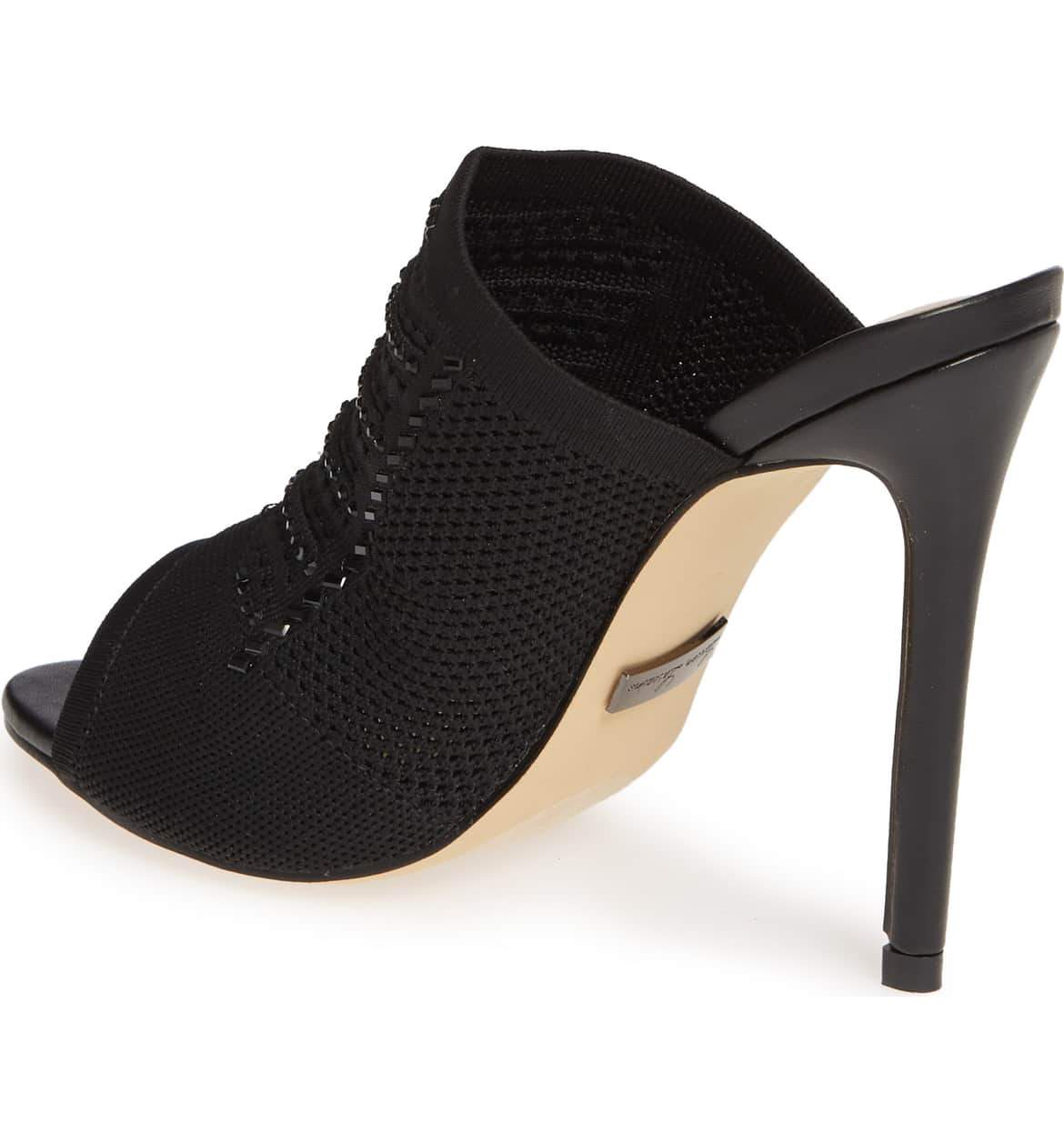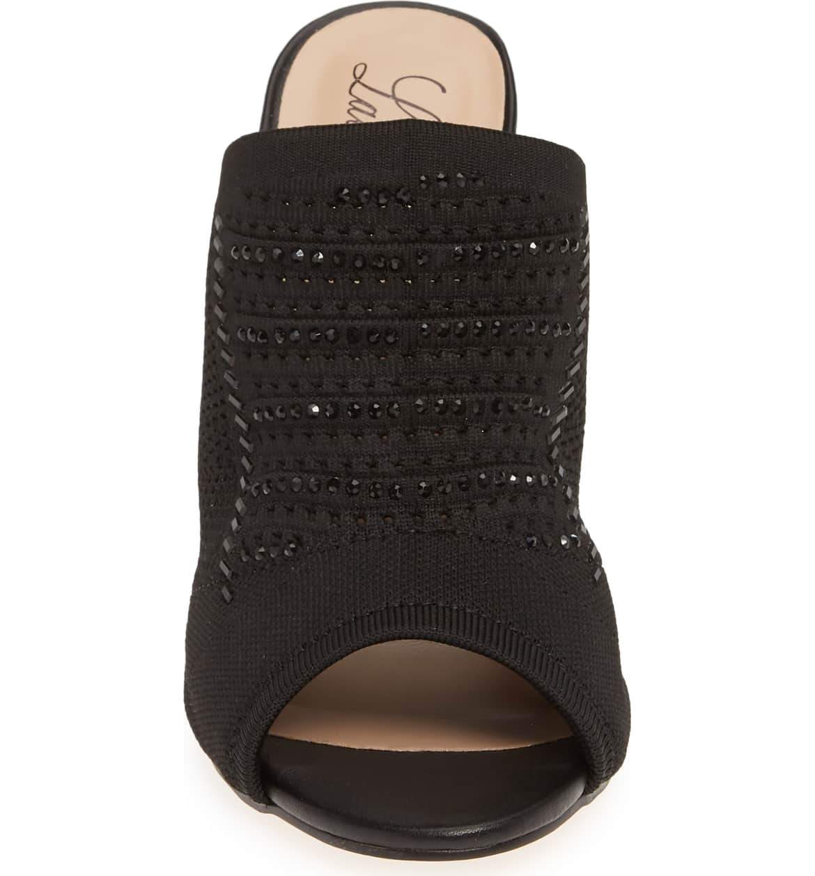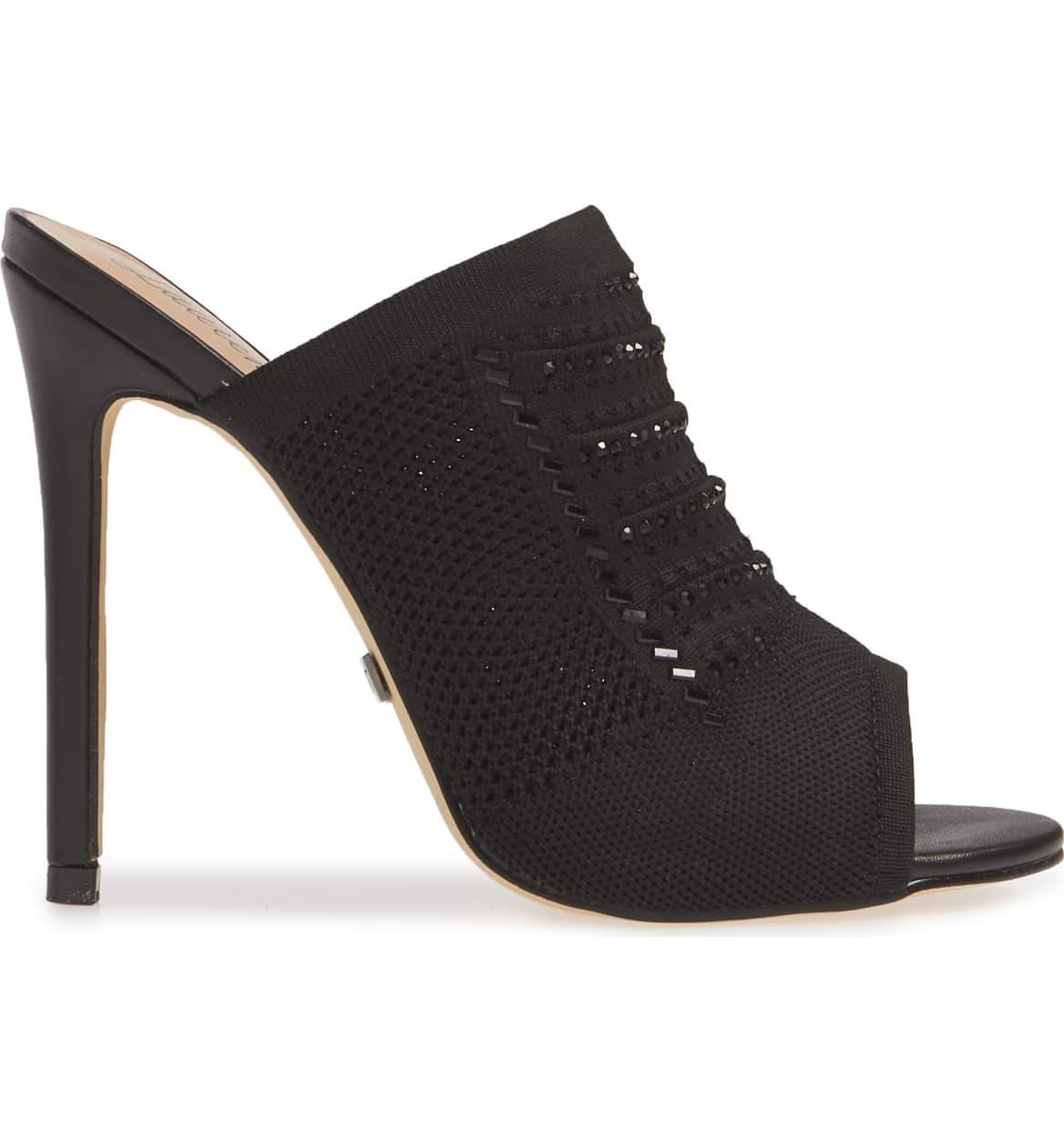 Tone on tone black glitter beads cover a fully stretch peep-toe slide mule with a delicate slim covered heel.