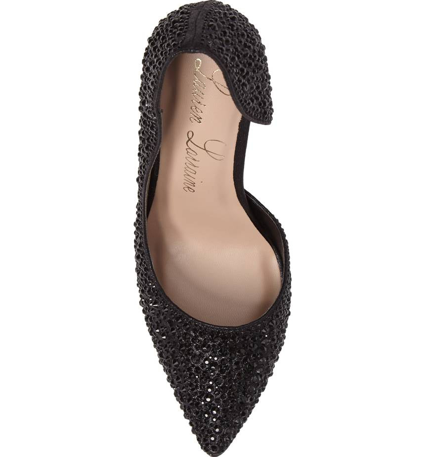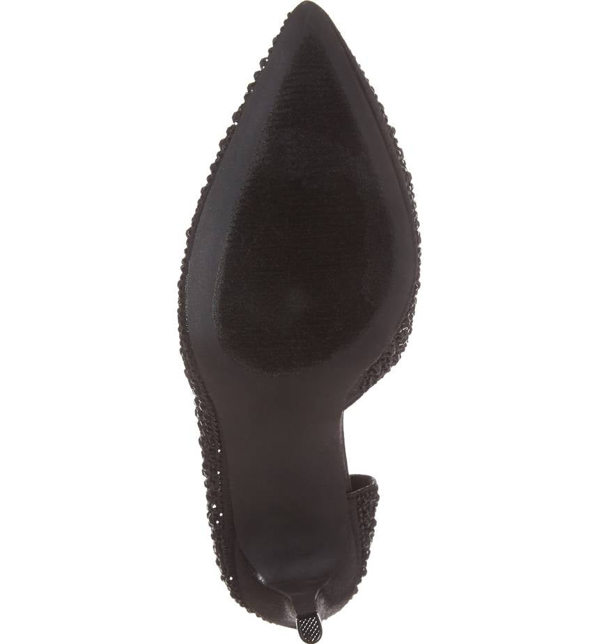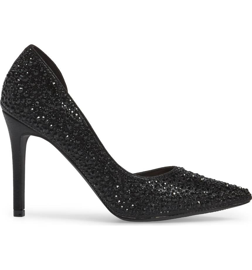 Multi-size crystals bring bold texture and dramatic shimmer to a pointy-toe evening pump styled with a flirty open side.