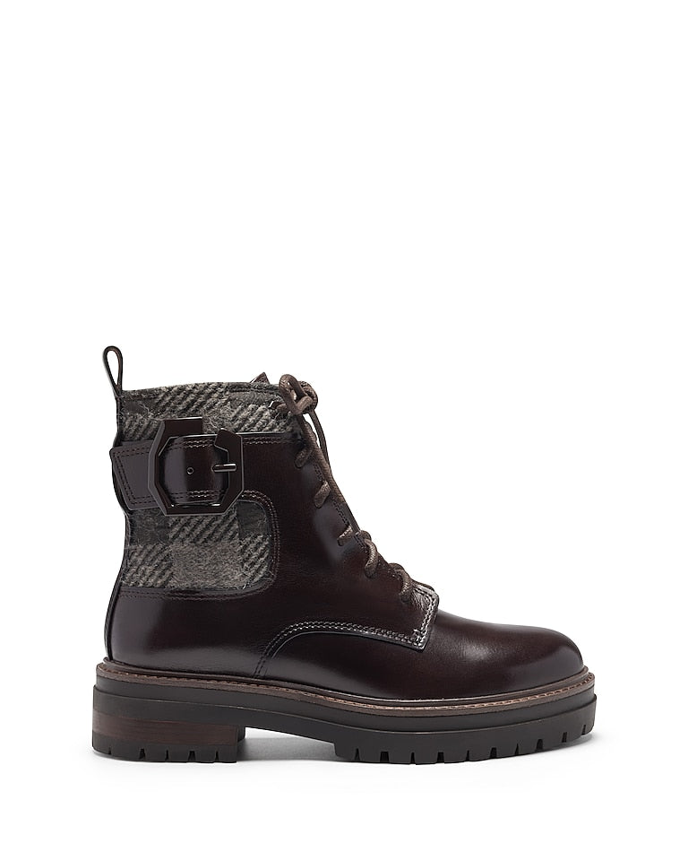 - Round toe; lace-up shaft; geo buckle hardware; lug platform and sole