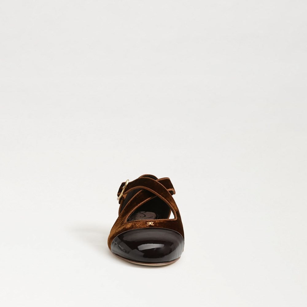 Take a moment to shine in the Roxie cutaway crisscross flat, finished with a brilliant contrast cap toe and mini block heel. The Roxie stands out when paired against masculine suiting pieces.
